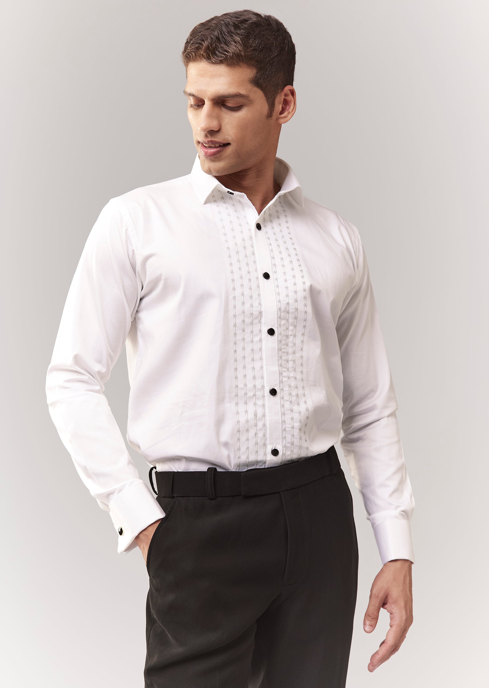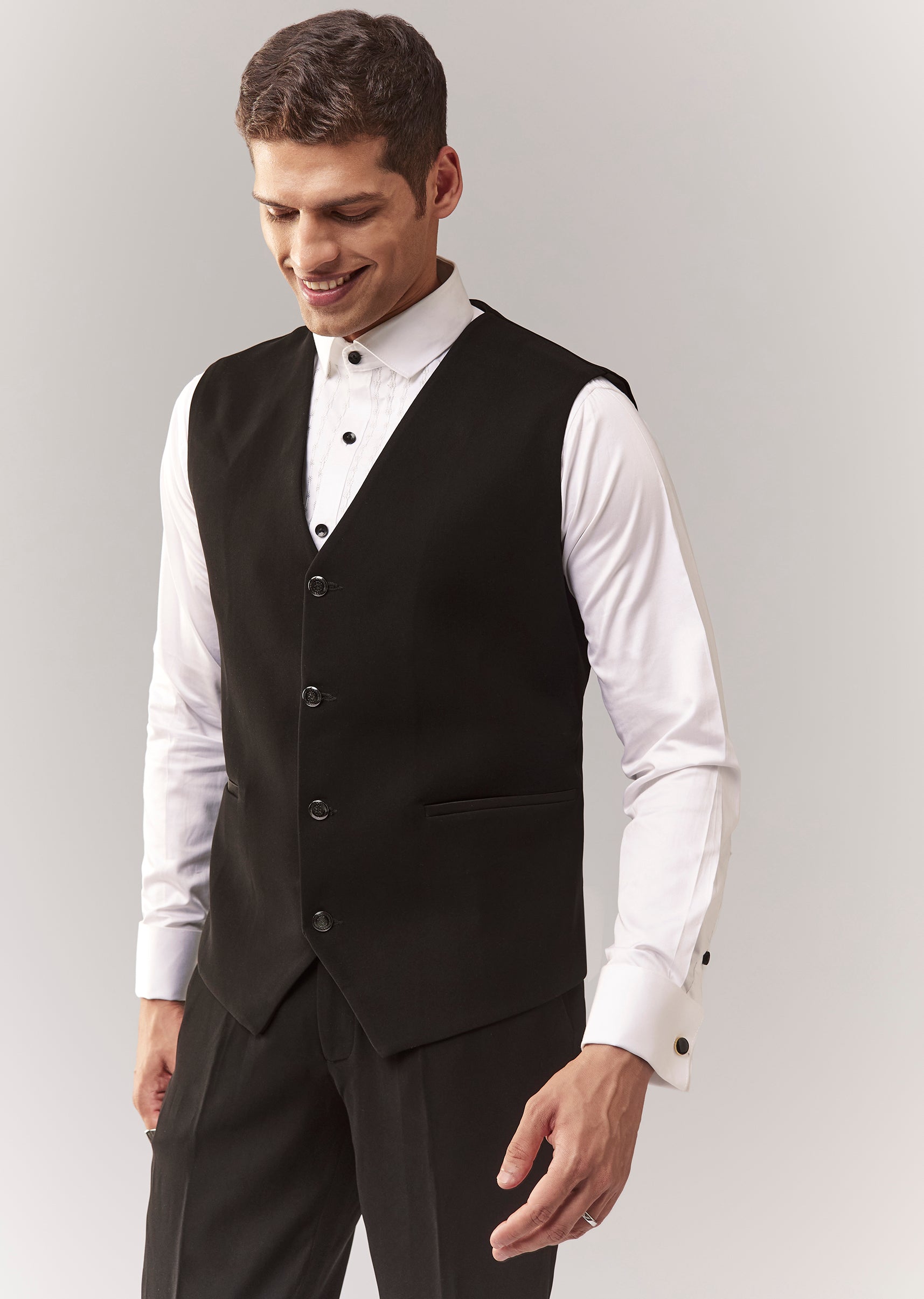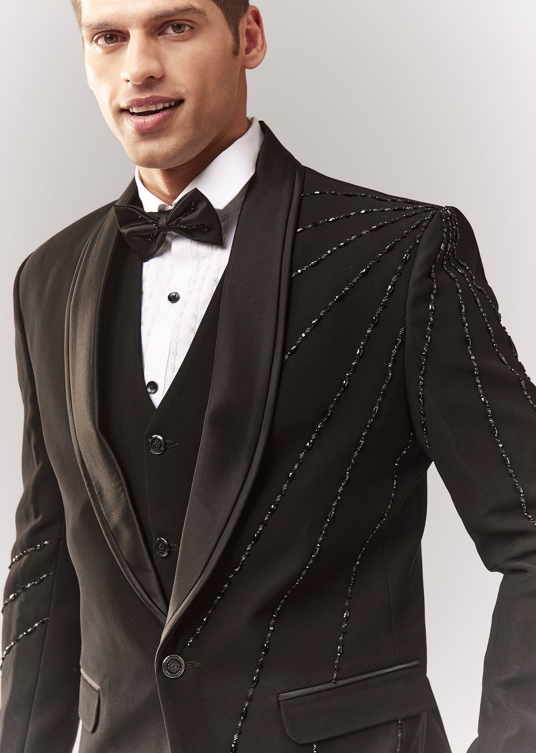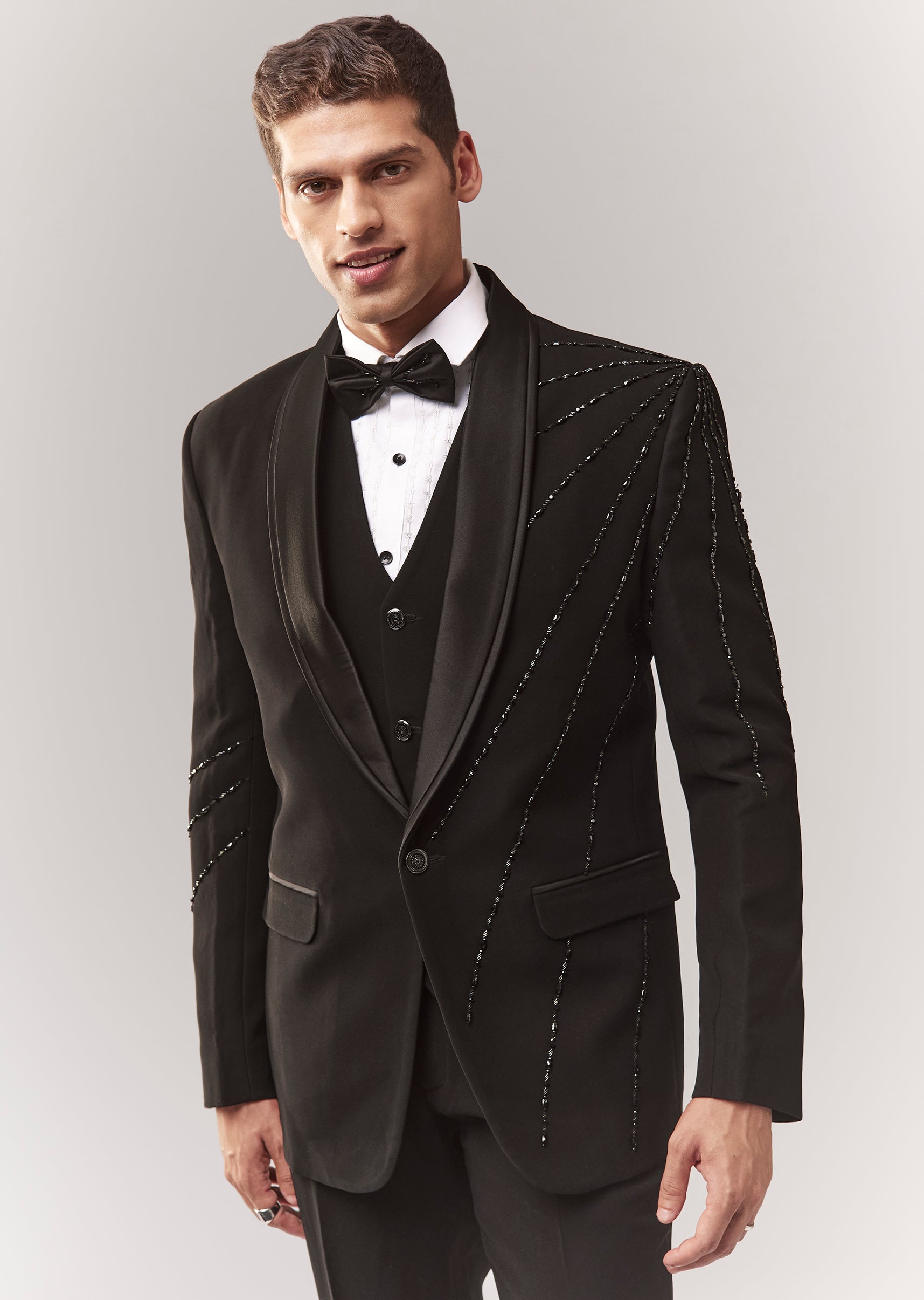 A complete black tuxedo set with waistcoat, bow, shirt, and trouser, featuring cutdana and stone detailing. Mandarin collar with front buttons and hook-eye closure. Great for cocktail/reception dressing where you want a sharp, formal finish. Awarded as the Most Trusted Brand, we're delivering styles you love, just as promised.