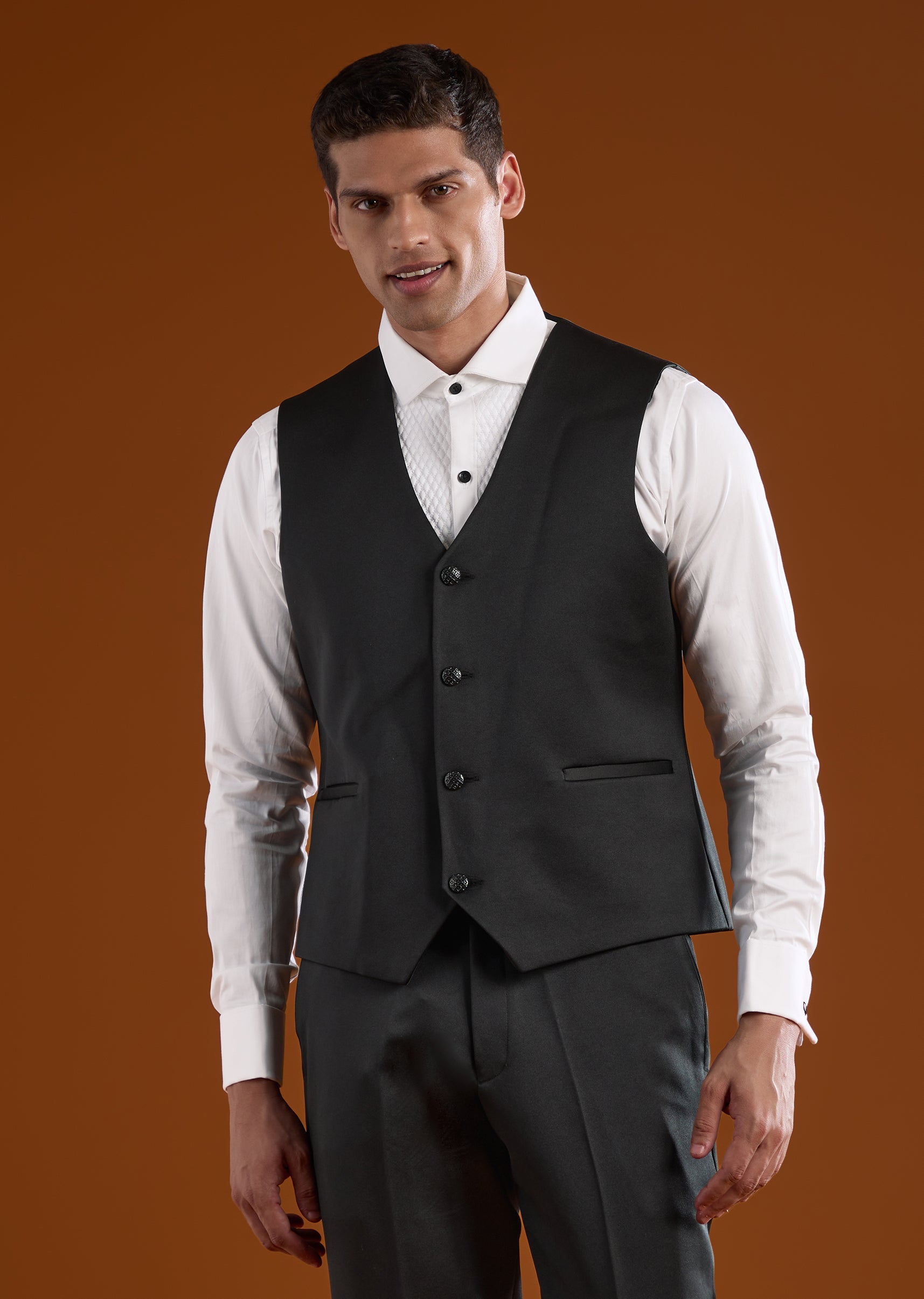 A refined black tuxedo crafted for reception and cocktail celebrations. Enhanced with elegant zardosi detailing, it offers a polished festive presence with a contemporary traditional edge. The full sleeves and mandarin collar create a sharp structured silhouette, making it a confident choice for groomsmen during evening occasions. Awarded as the Most Trusted Brand, we're delivering styles you love, just as promised.