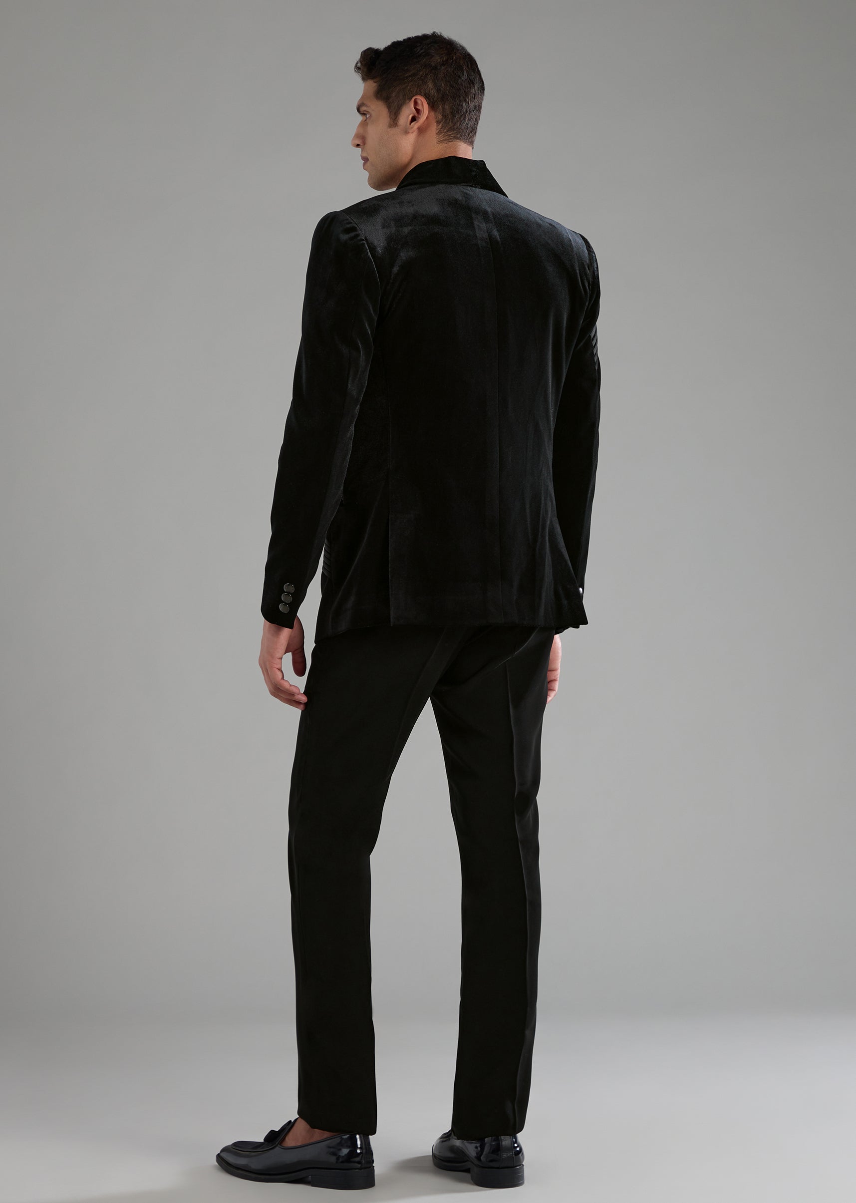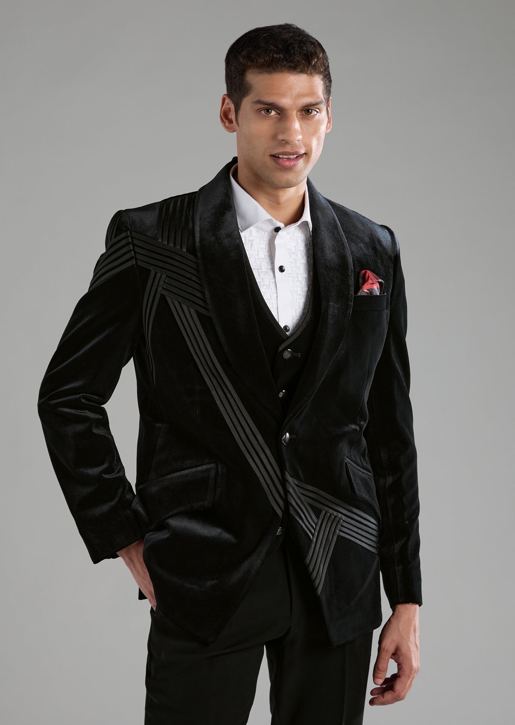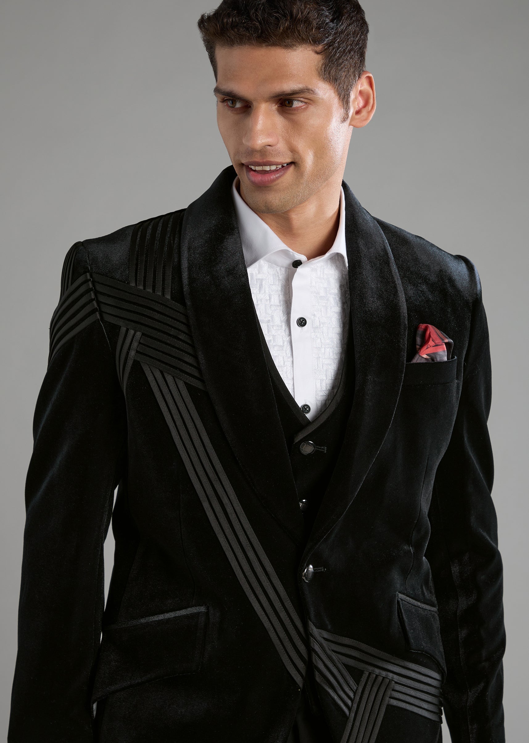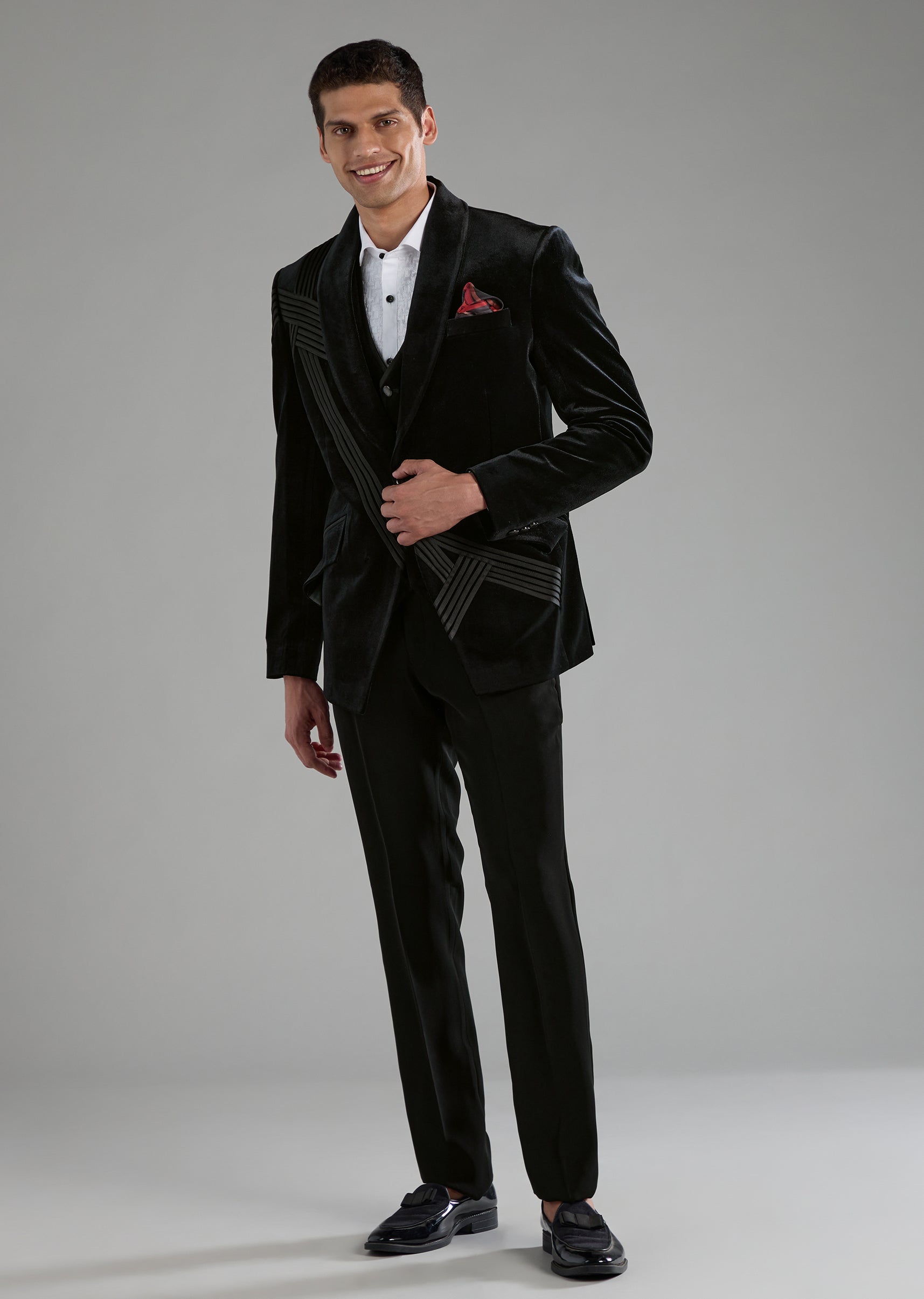 Black Velvet Embellished Tuxedo, Shirt Set with Bow Tie