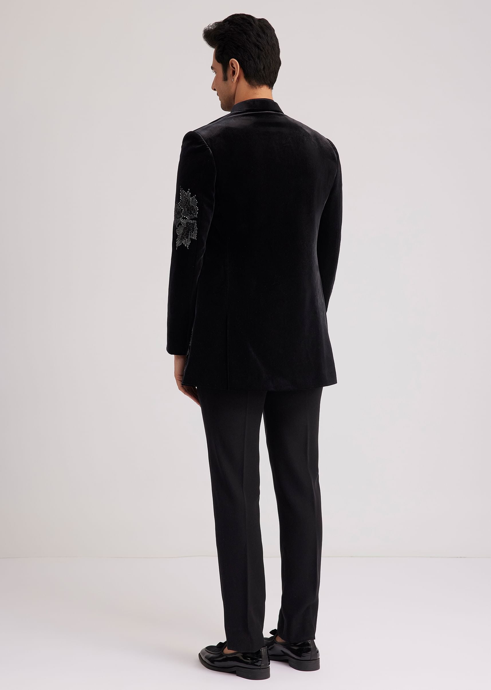Command Attention In This Striking Black Velvet Indo Jacket Set Featuring An Openfront Design With Intricate Abstract Patterns Adorned With Cut Dana Work. The Silver Stitch Detailing On The Inner Kurta Placket Adds A Subtle Yet Luxurious Touch Enhancing The Ensemble'S Refined Aesthetic. Paired With A Sleek Kurta And Tailored Trousers This Outfit Embodies A Perfect Blend Of Modern Sophistication And Timeless Grandeur. A Stellar Choice For Evening Galas And Festive Celebrations.Awarded As The Most Trusted Brand We'Re Delivering Styles You Love Just As Promised.