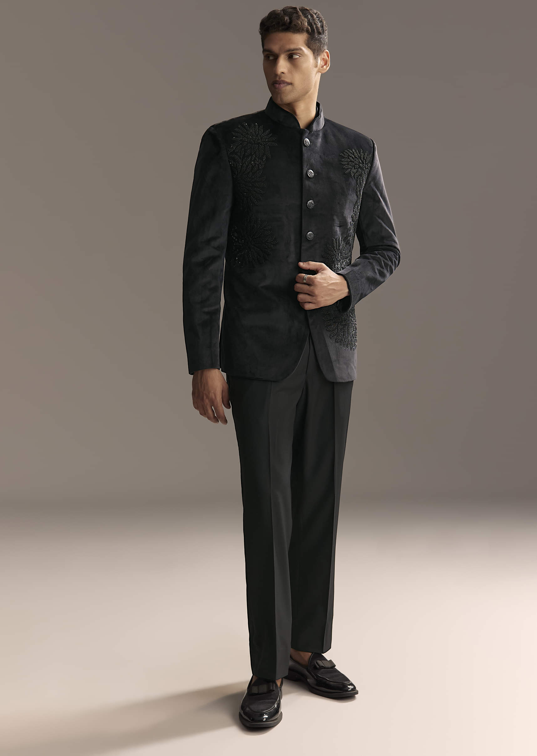For formal celebrations, this black velvet menâs jodhpuri suit uses tonal floral embroidery to add quiet shine to a classic bandhgala shape. Structured shoulders and covered buttons complete a strong,... More Product Details