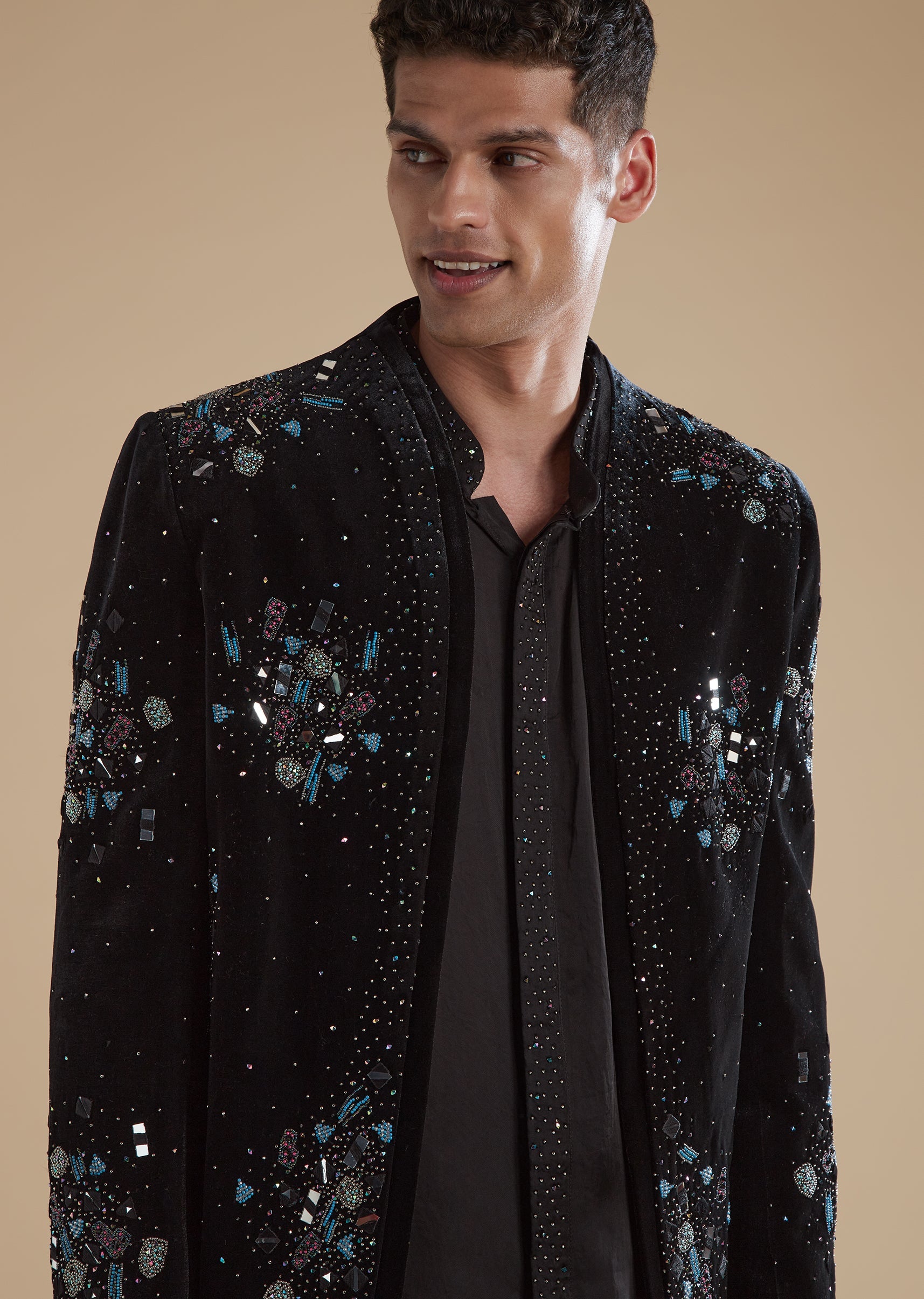 Black Velvet Mens Indowestern with Mirror Beads Detail Work
