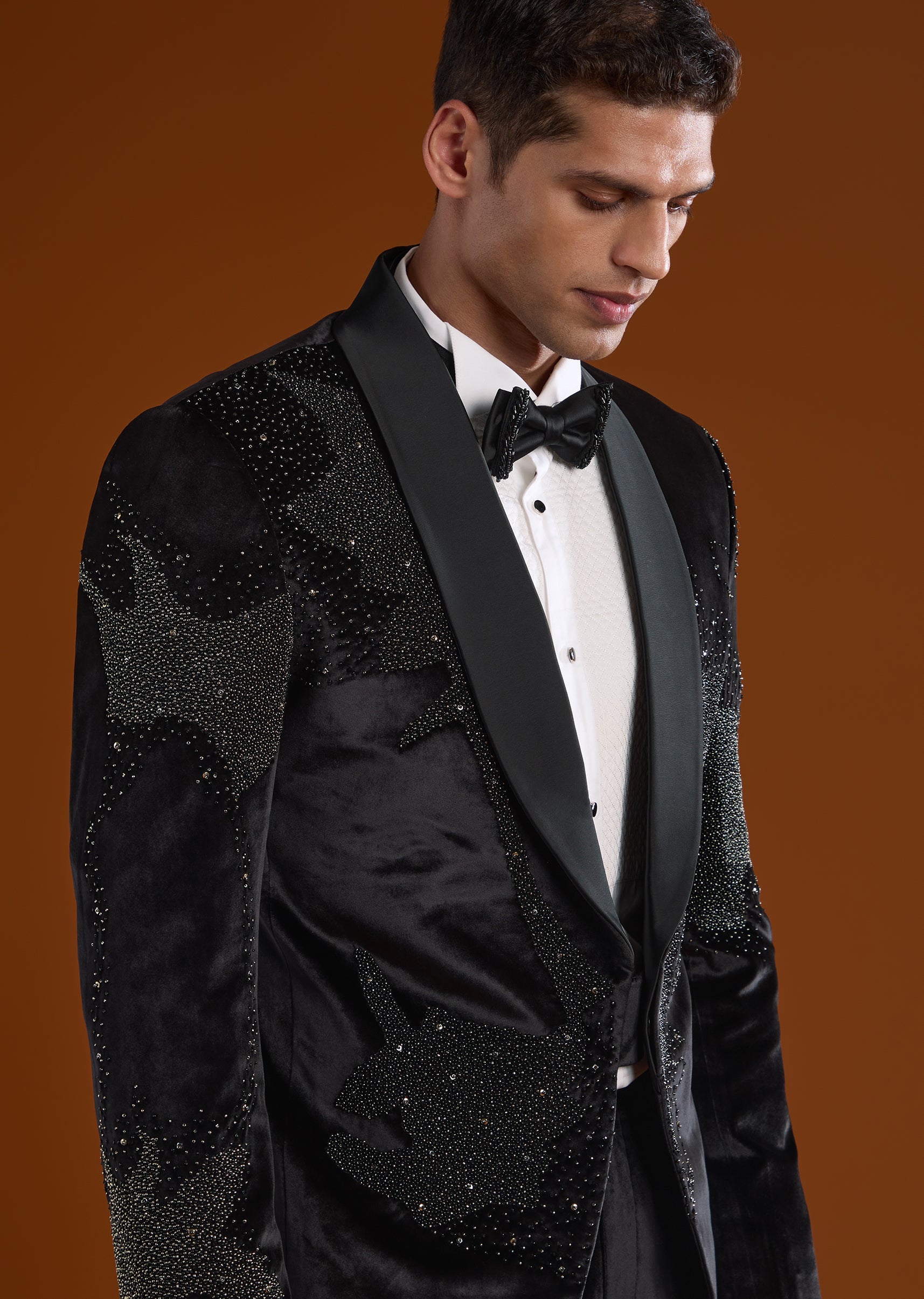 A luxurious black velvet tuxedo designed for sangeet, cocktail, and reception celebrations, perfect for groomsmen. With a contemporary cut and structured silhouette, it combines modern elegance with festive charm. The full sleeves and mandarin collar complete a polished and stylish look for evening wedding occasions. Awarded as the Most Trusted Brand, we're delivering styles you love, just as promised.