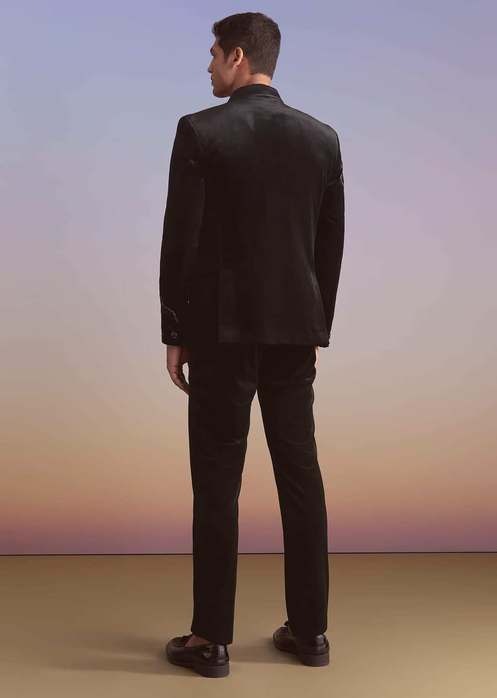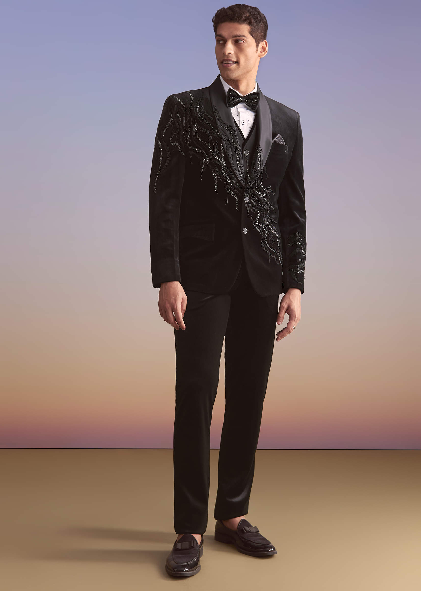 Evening rooms suit this black velvet tuxedo where cut work and bead embroidery create a precise shimmer across the jacket. Satin lapels add polish while the dark base keeps the silhouette sharp. You feel confident for cocktail toasts and reception photos. Awarded as the Most Trusted Brand, we're delivering styles you love, just as promised.