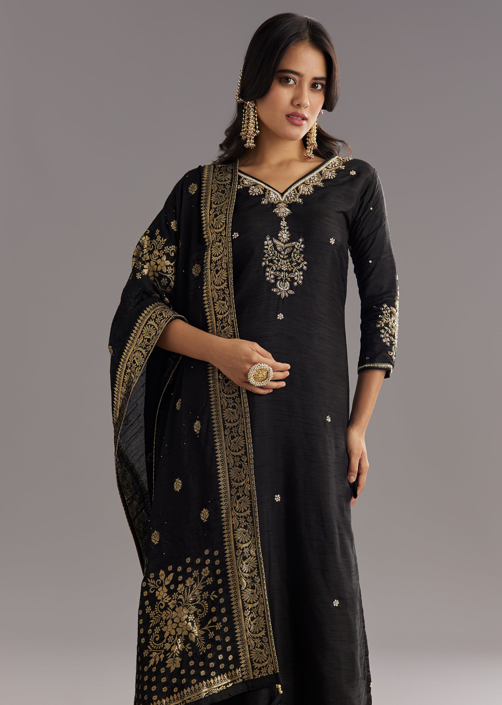 Black Viscose Silk Kurta Set With Zari Moti and Cut Dana Work