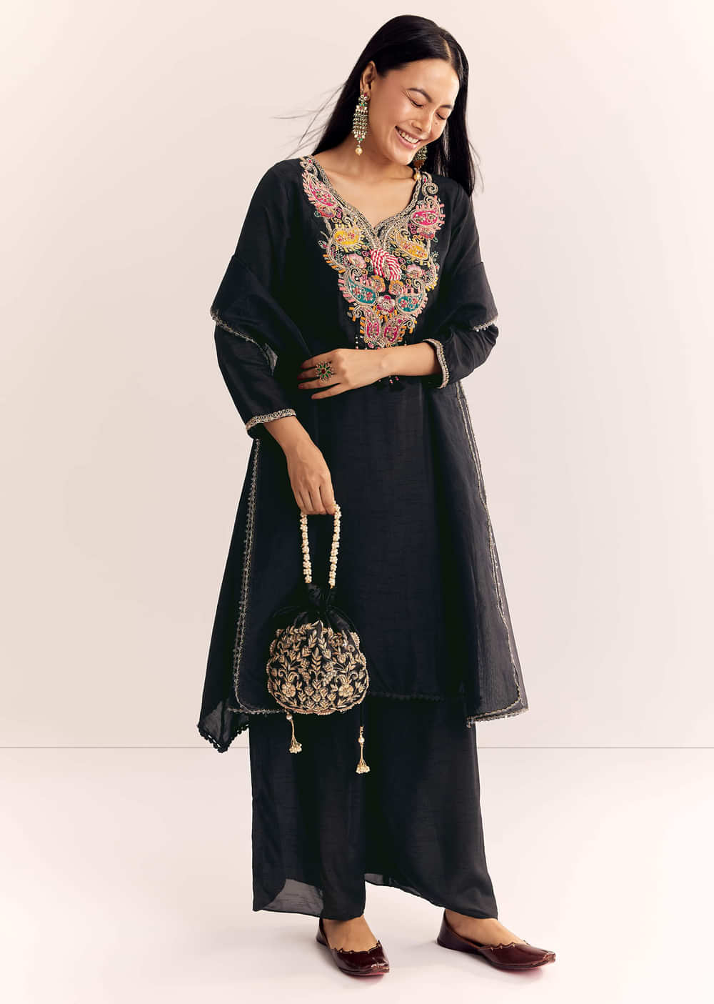 Black Zardosi Work Dola Silk Kurta Set With Organza Dupatta