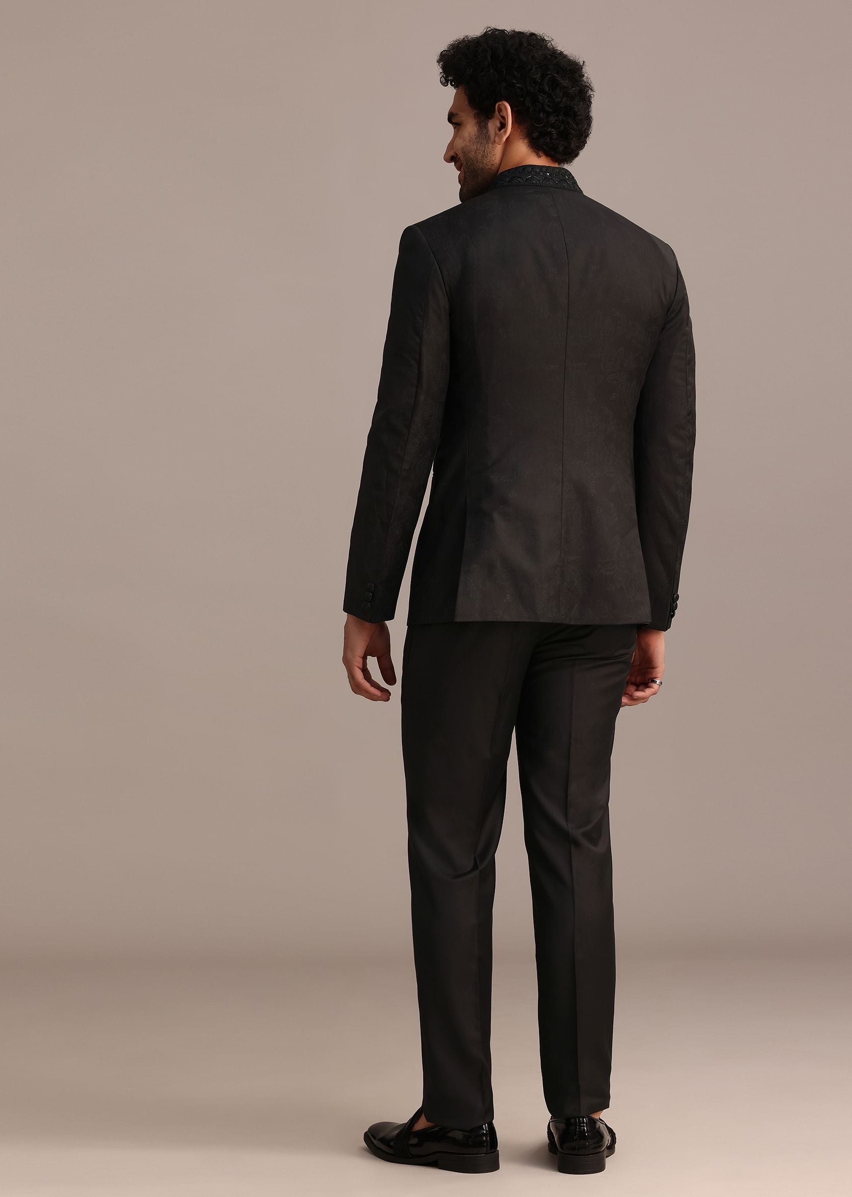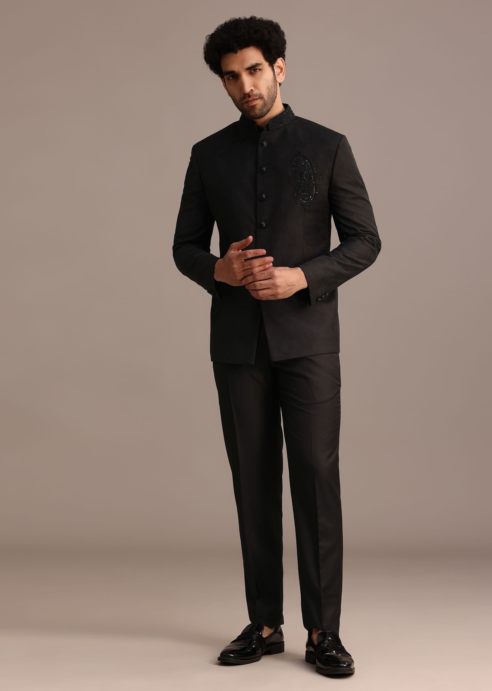 - Crafted in a tonal black hue, on comfortable suiting, the jacket features intricate zari and sequin work.