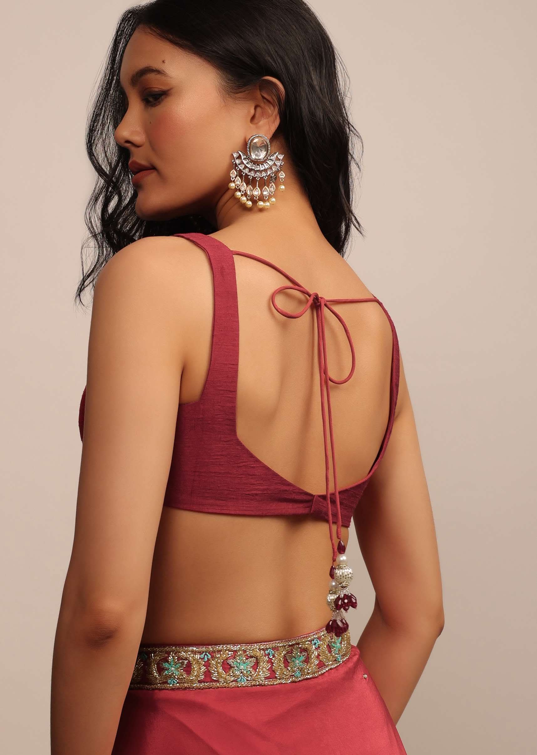 Blood Red Sleeveless Blouse In Raw Silk With Sweetheart Neckline