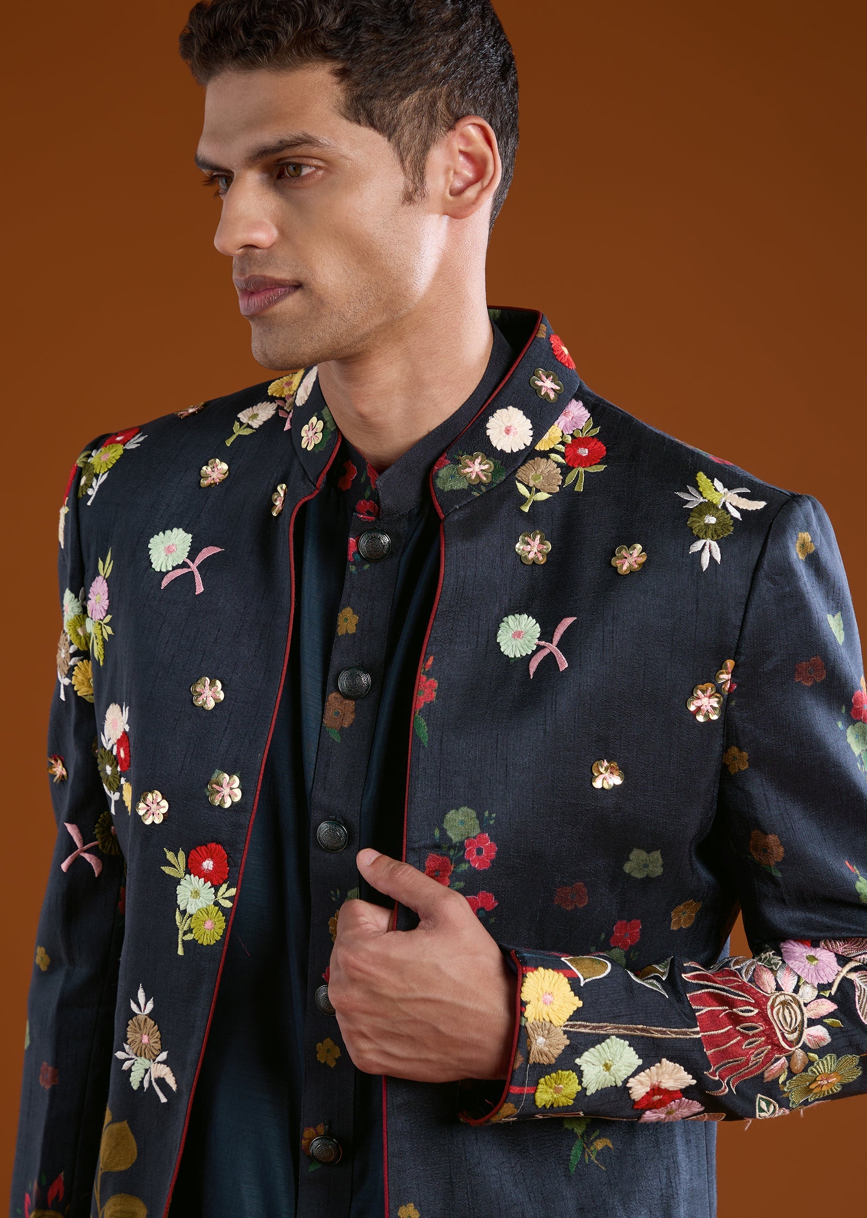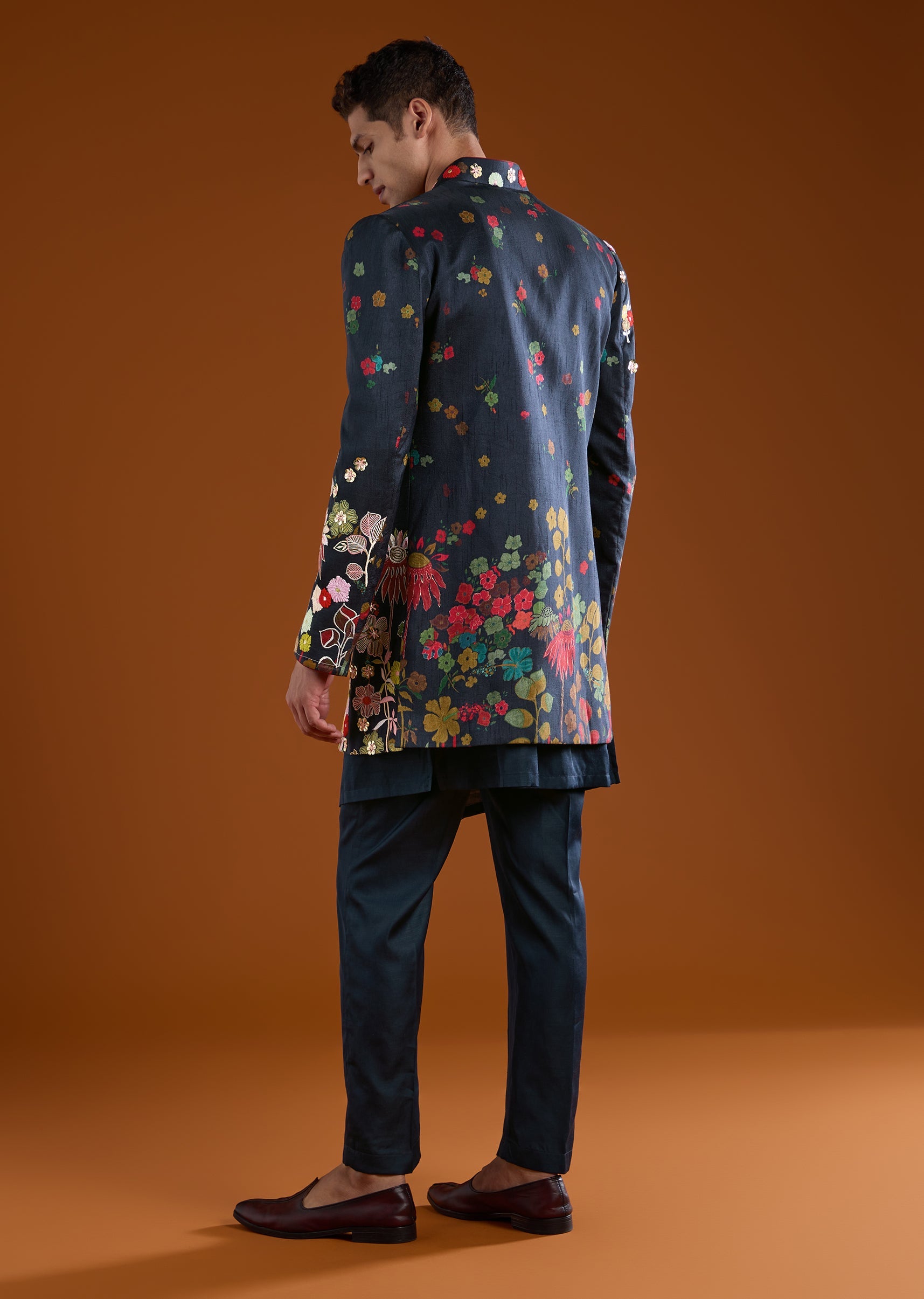Pair it with embroidered juttis and a simple pocket square or brooch to enhance its elegant indowestern appeal.