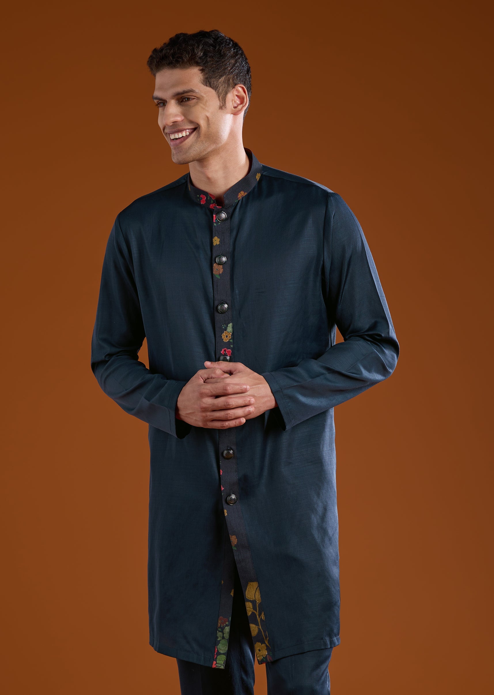 Blue Art Silk Mens Indowestern Kurta Pant Set
