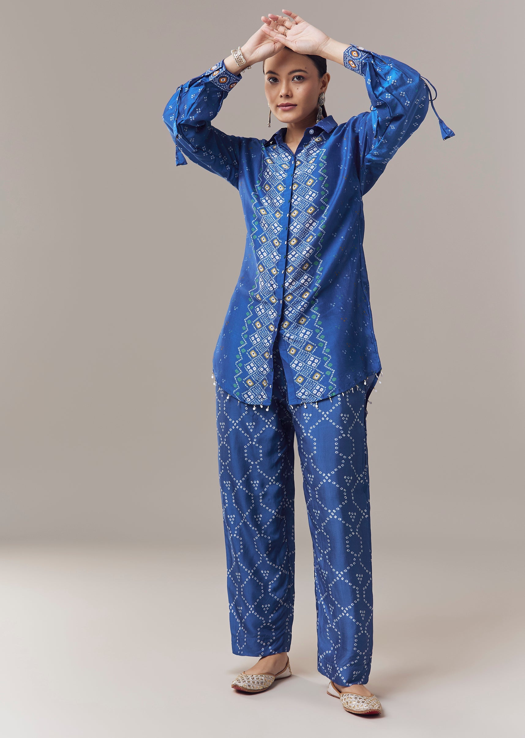 Blue Bandhani Print Silk Coord Set With Beads Detail