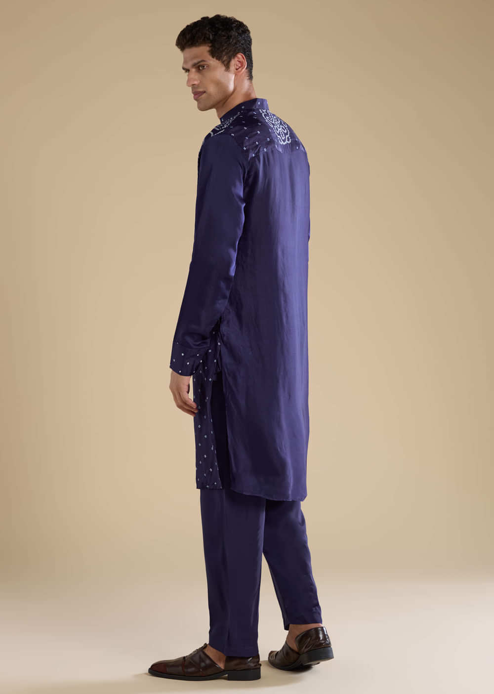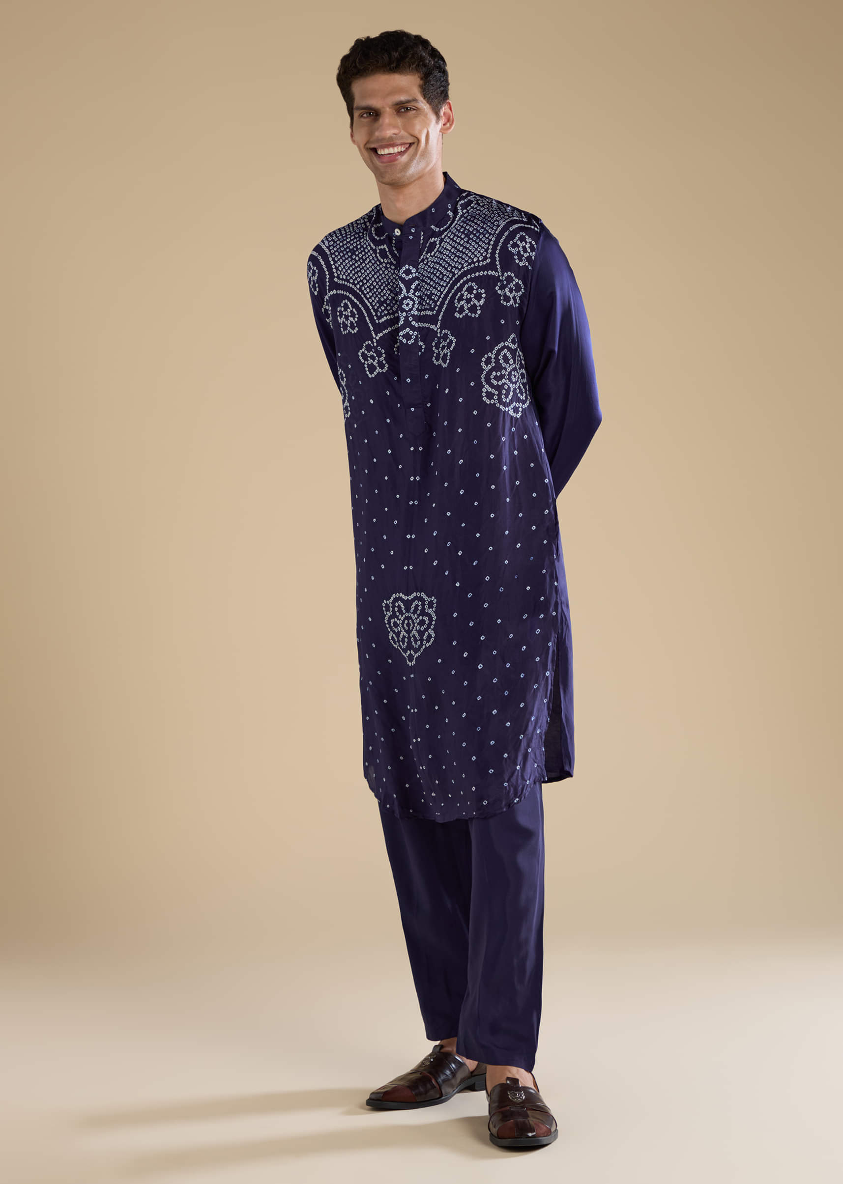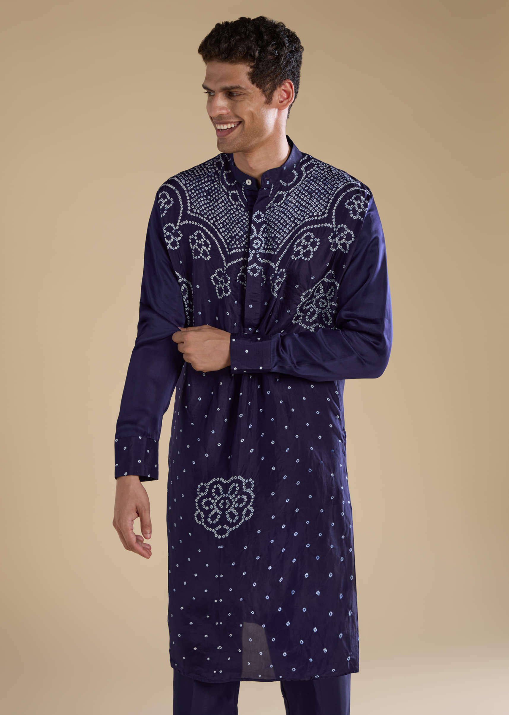 Blue Bandhani Silk Mens Straight Kurta Pant Set