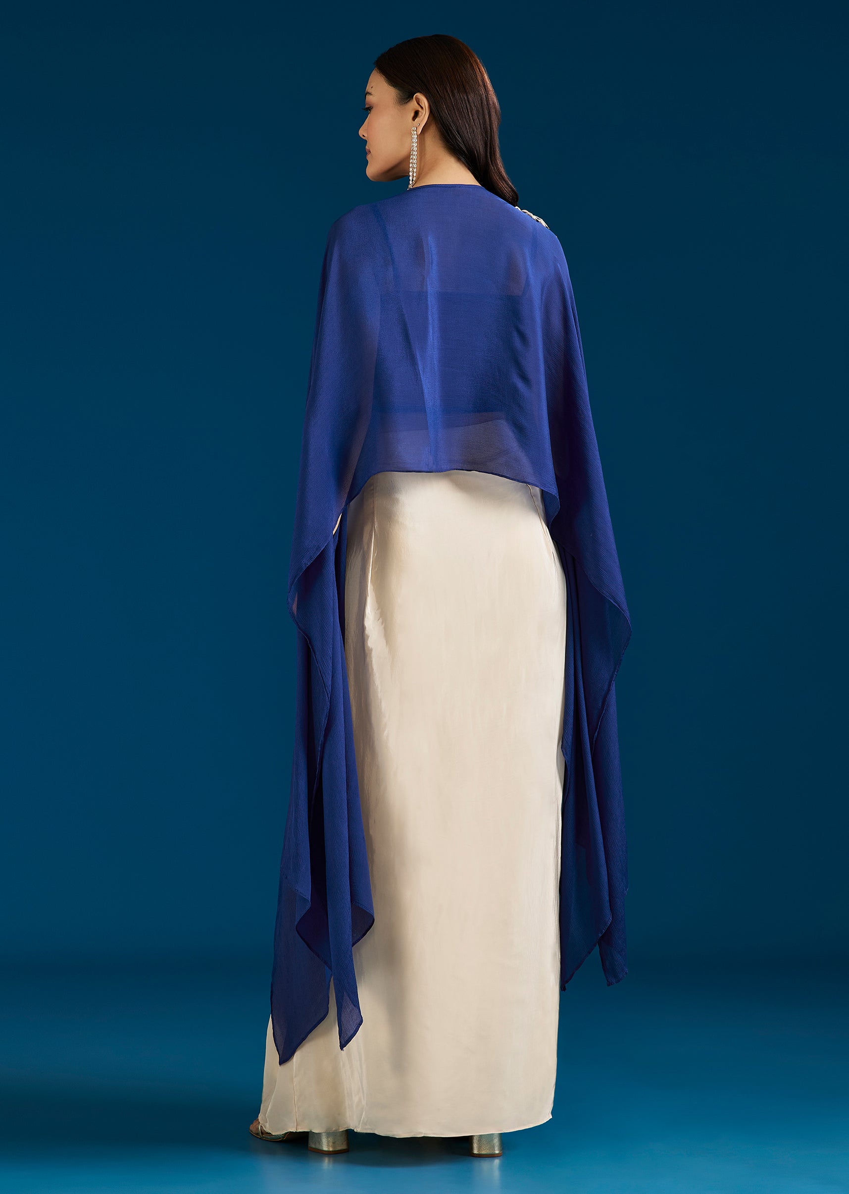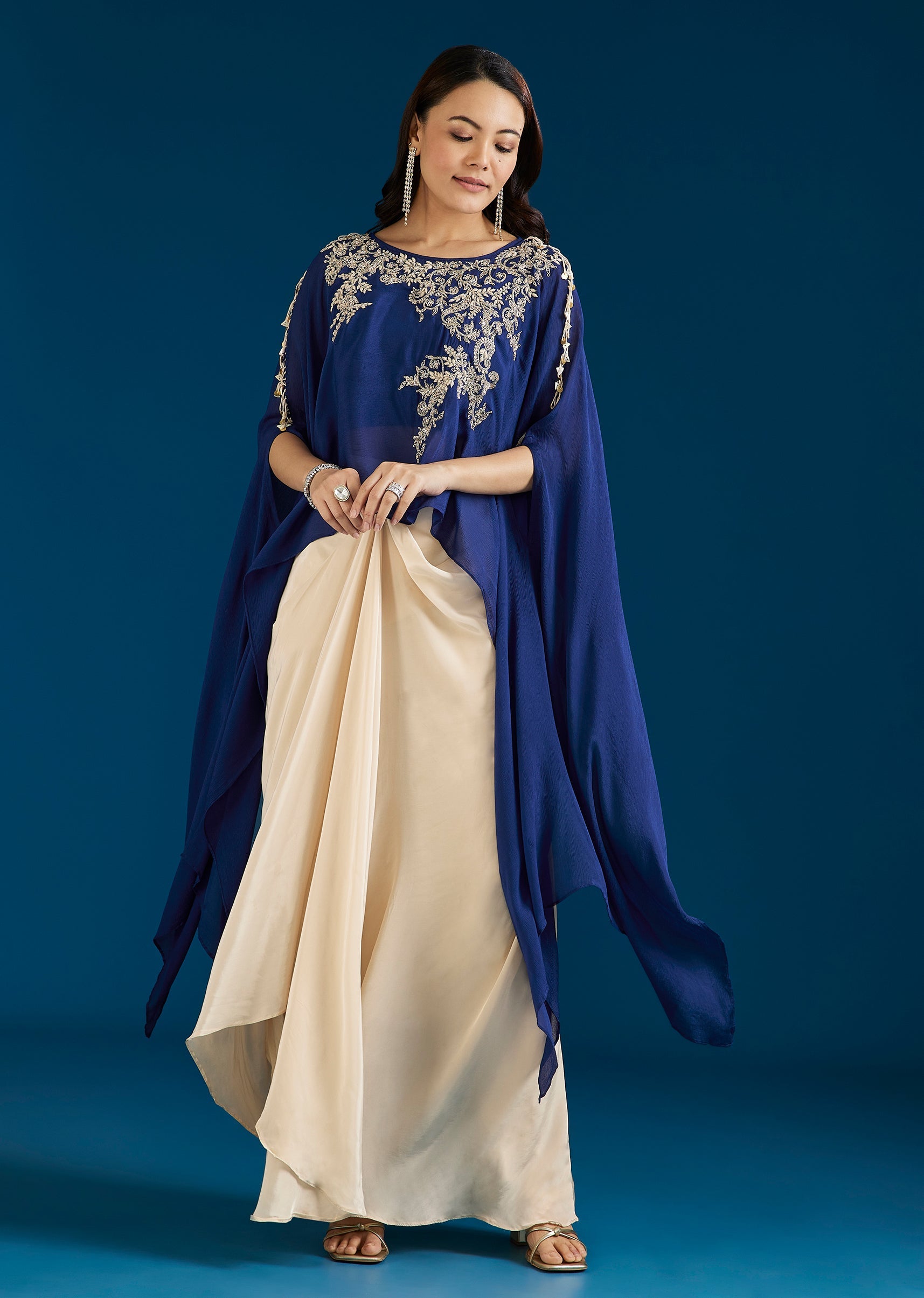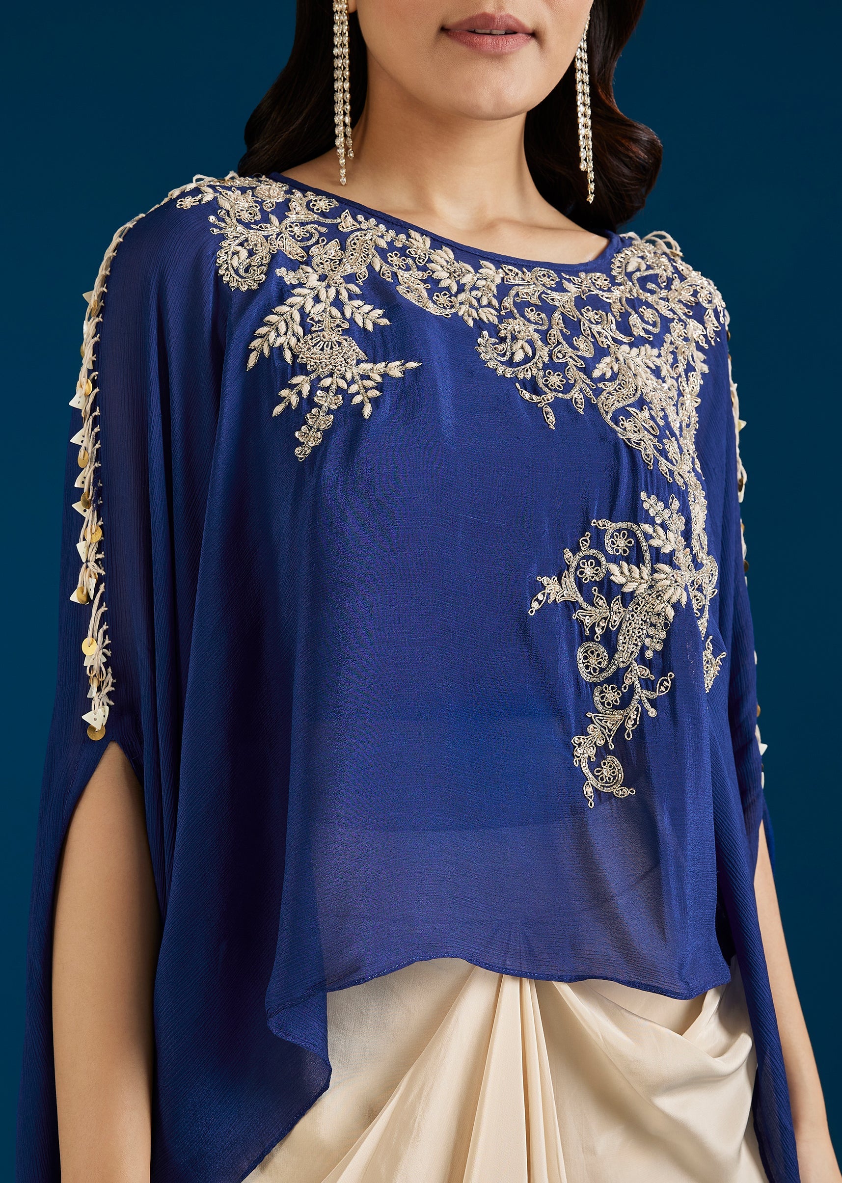 A contemporary blue Indo Western set featuring a cut dana and thread work crop top, layered with a cape and paired with a drape skirt. Fashion-forward and festive, it is... More Product Details