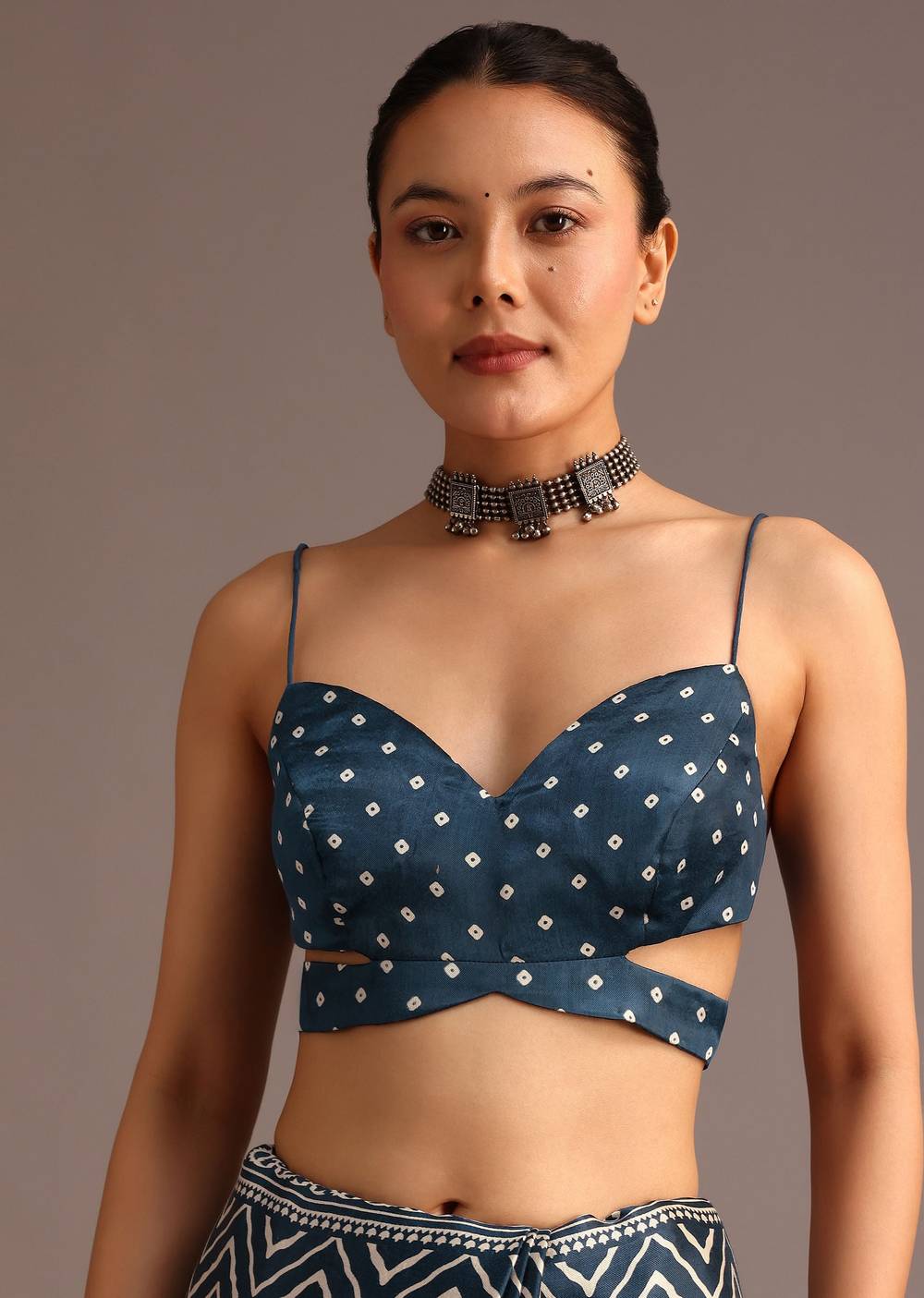 This elegant saree is made from soft and luxurious satin fabric, offering a smooth and glossy finish. It features a striking blue chevron and Ajrakh print, enhanced by a mirror-embellished... More Product Details