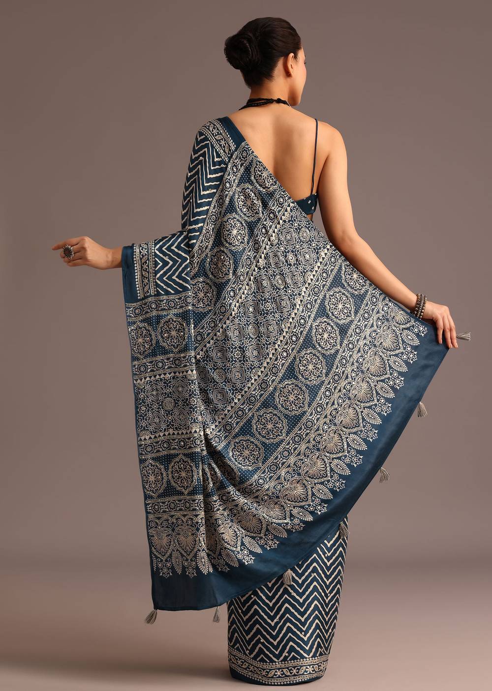 Blue Chevron And Ajrakh Printed Satin Saree