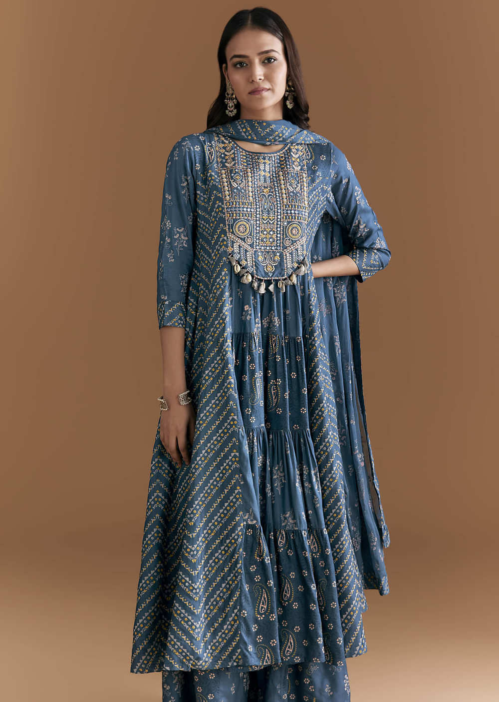 Blue Cotton Embroidered Anarkali Suit With Floral And Paisley Print