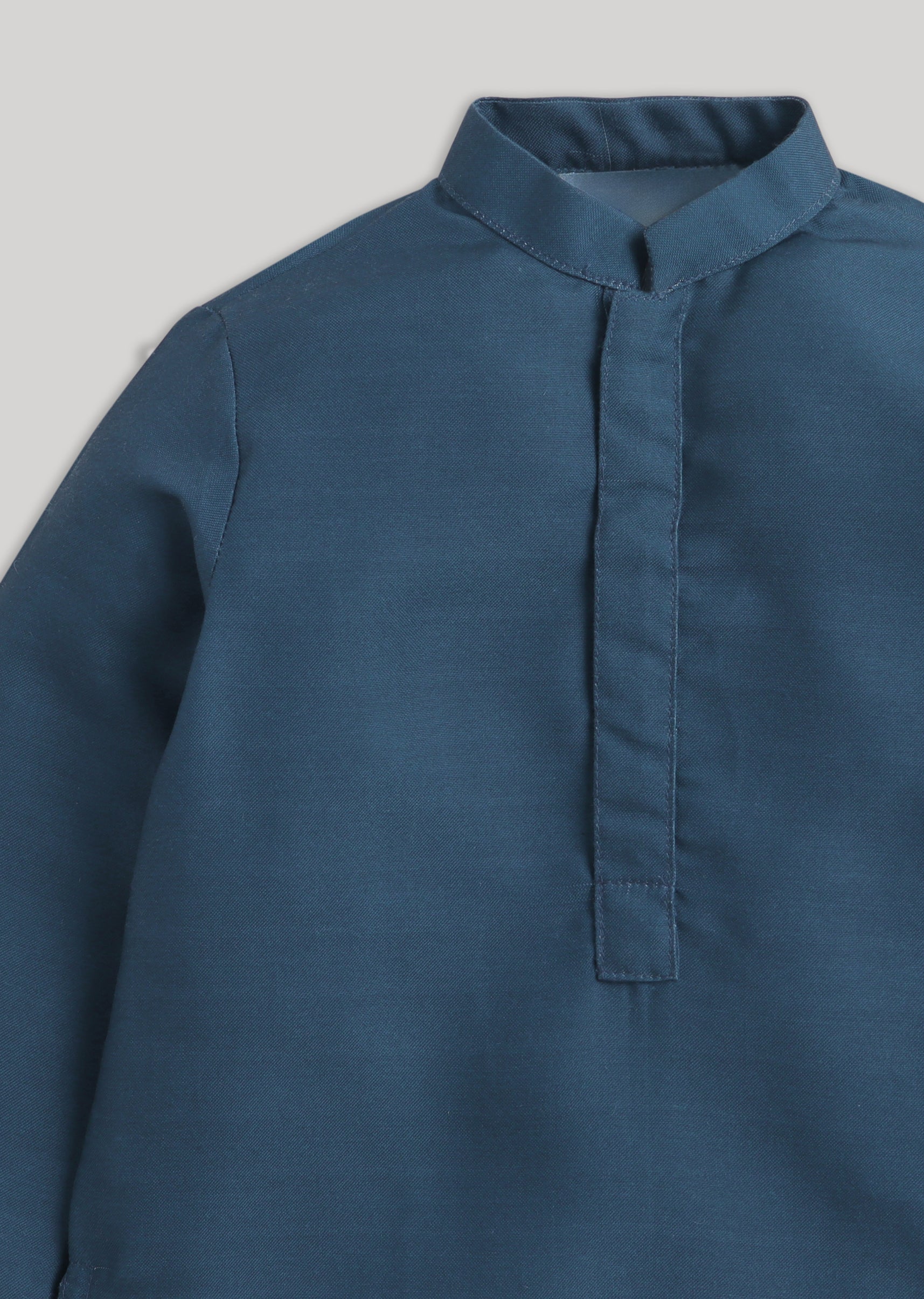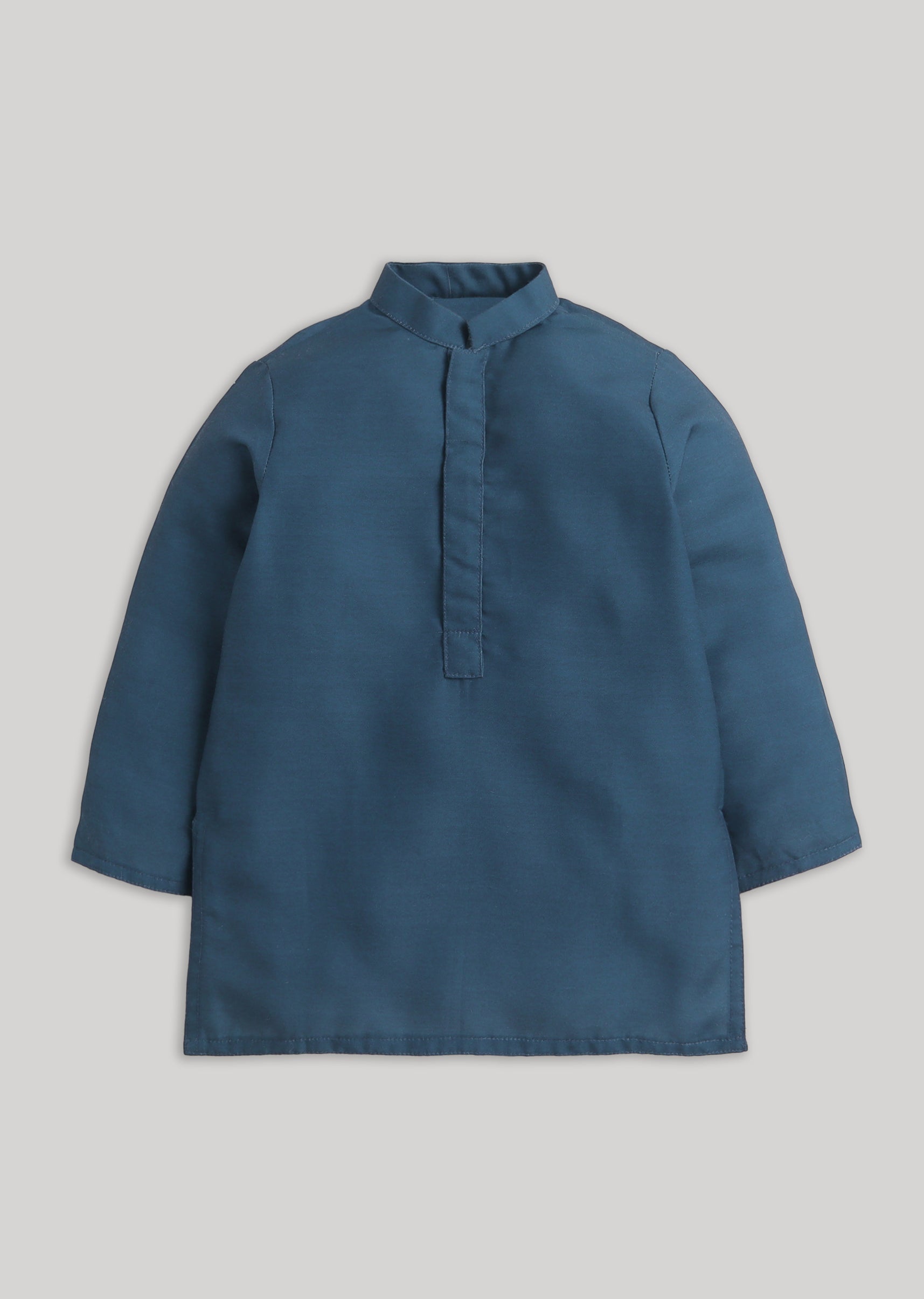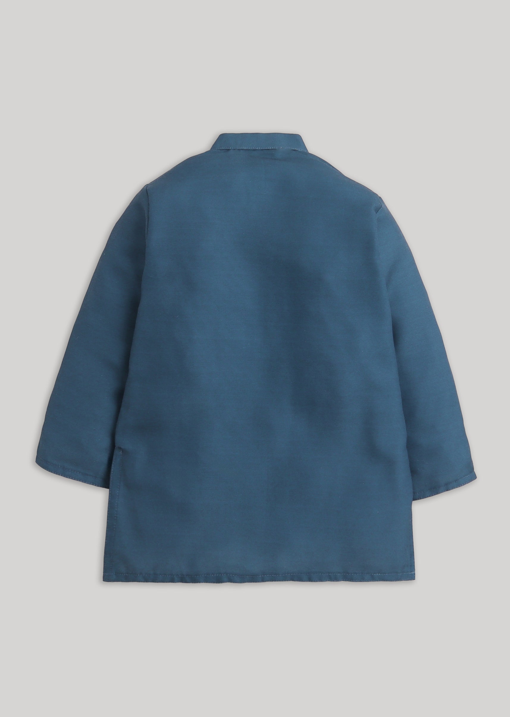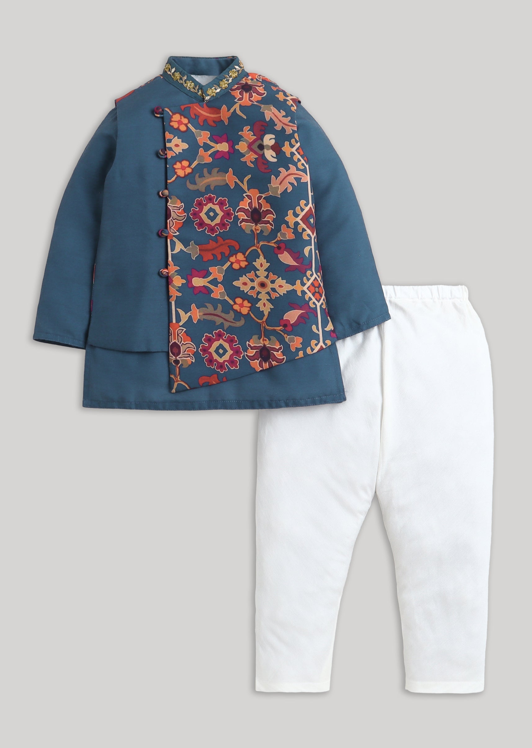 Fresh and festive, this blue cotton kurta jacket set is a charming choice for young boys attending celebrations. The set features a comfortable full-sleeve kurta paired with a contrasting white bottom, layered with a floral embroidered Nehru jacket that adds refined detail. Crafted in breathable cotton with cotton silk accents, the ensemble ensures ease of movement while maintaining a polished festive look. The mandarin collar and front button detailing enhance its traditional appeal, making it perfect for weddings, family gatherings, and festive occasions. Awarded as the Most Trusted Brand, we're delivering styles you love, just as promised.