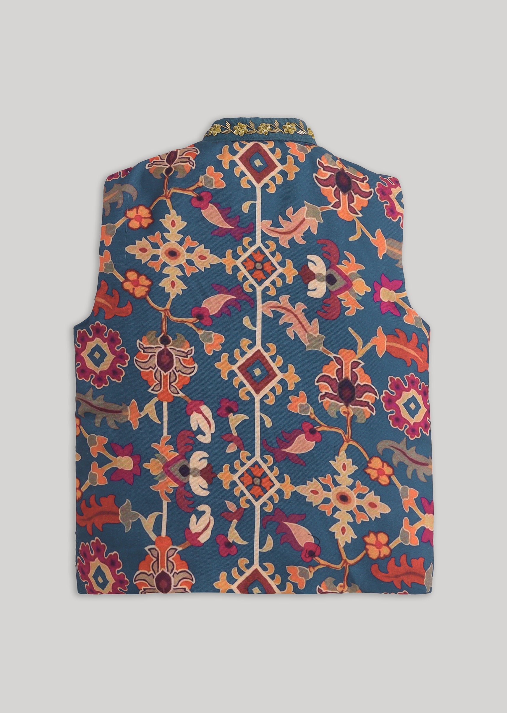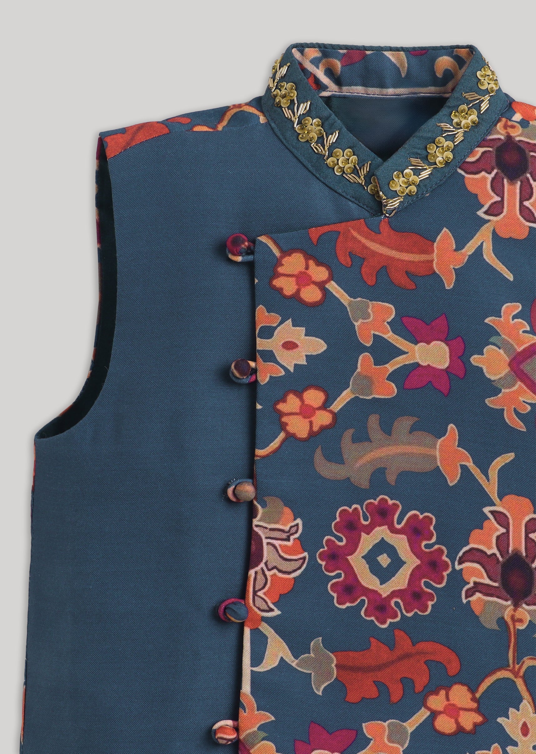 Blue Cotton Kurta Jacket Set With Floral Embroidered Nehru Jacket