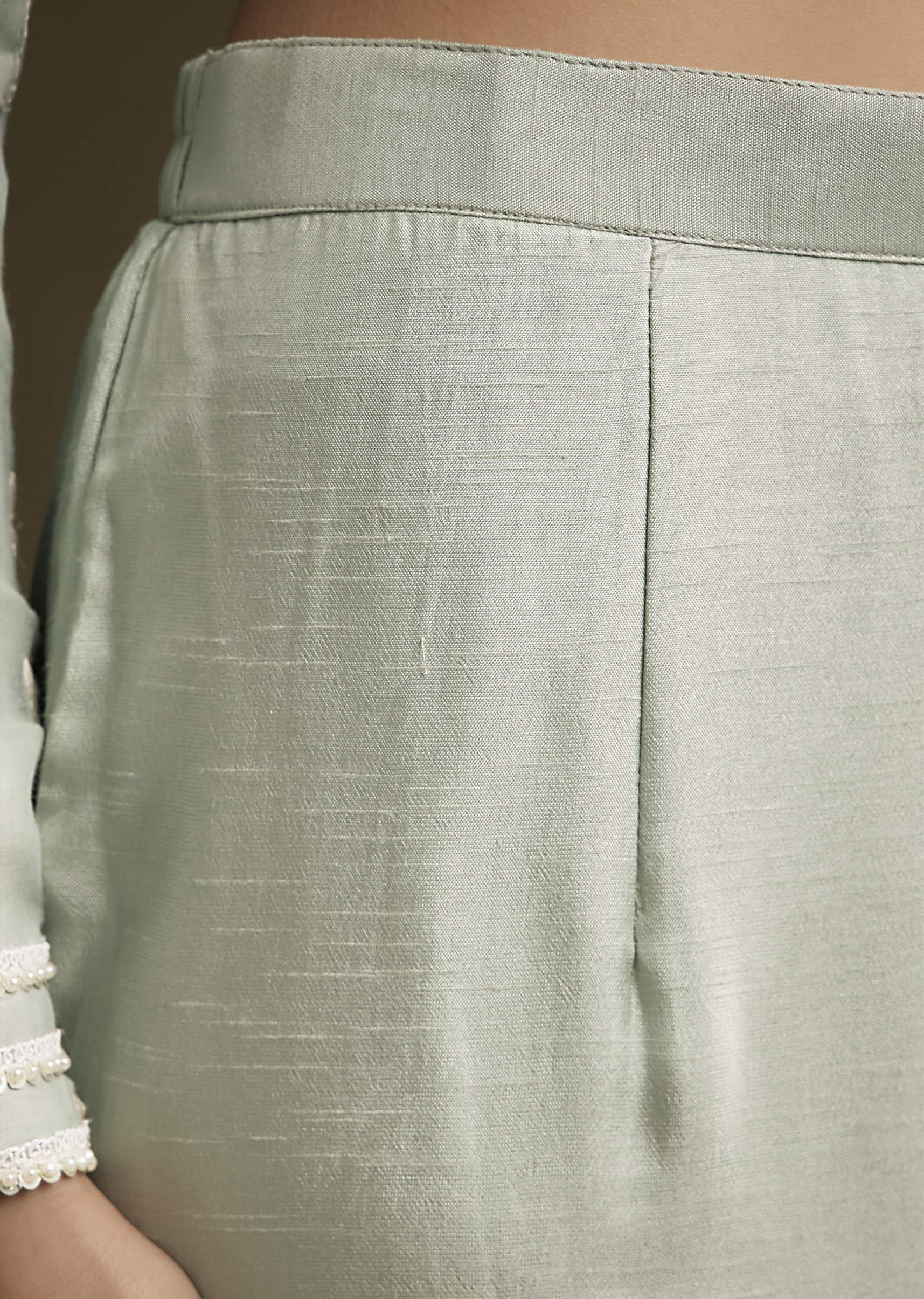 The kurta should feel straight and breathable, while the trousers sit at a natural waist with a clean, straight leg.