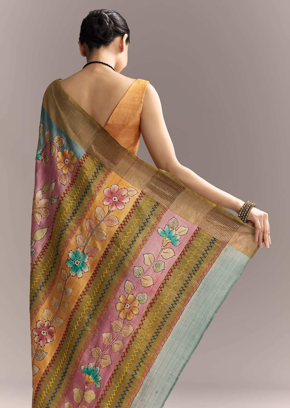 Shaded in blue and onion pink, this cotton saree feels fresh and vibrant with authentic hand-painted motifs. A contrast brown border and Kantha work give it depth. It is colourful... More Product Details
