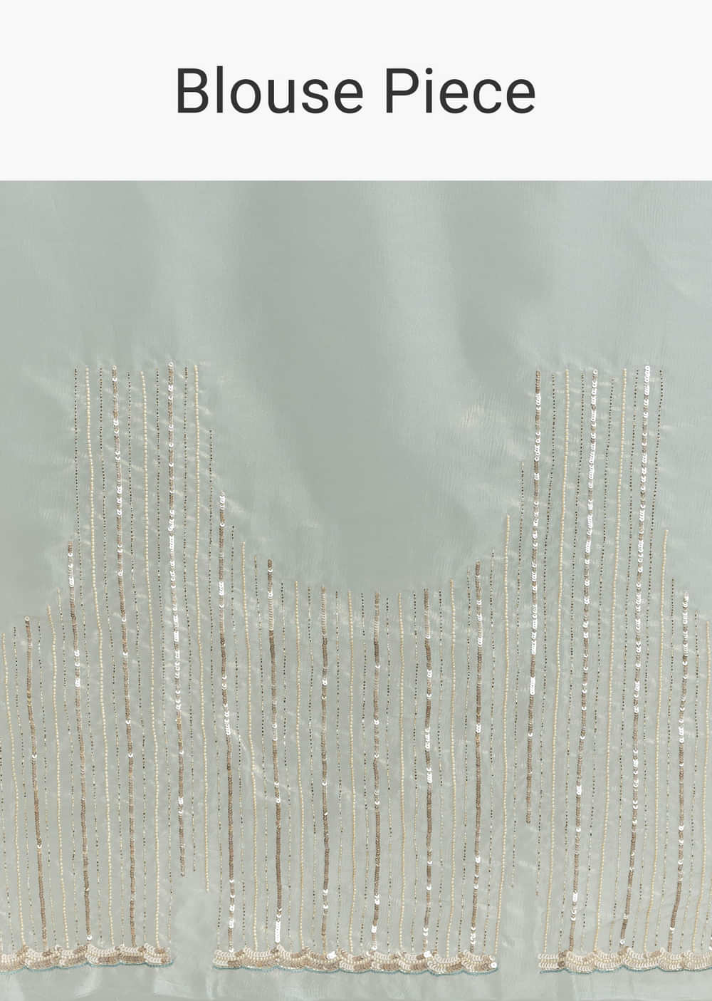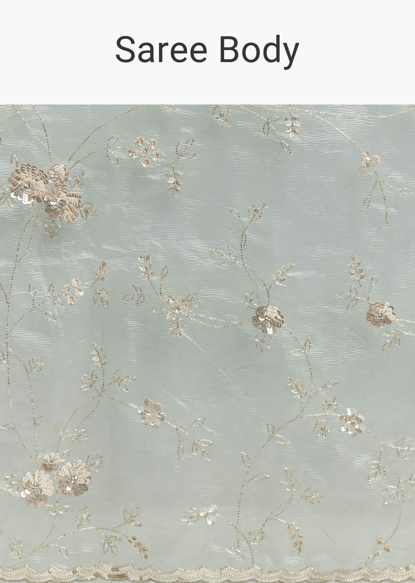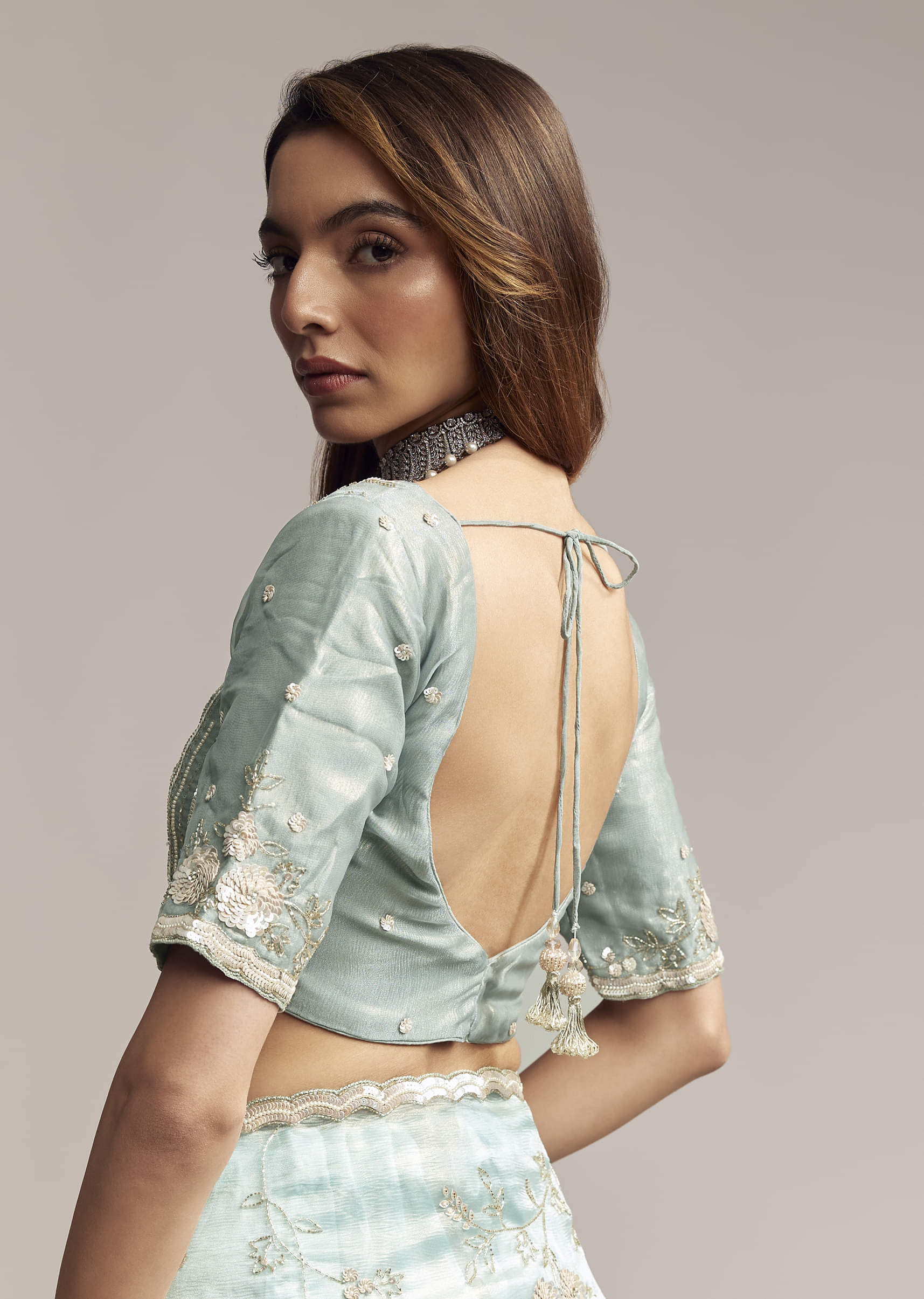 Wrapped in a dreamy hue, this blue crush tissue saree glistens with floral jaal embroidery that catches the eye from every angle. The blouse and saree are drenched in detail,... More Product Details