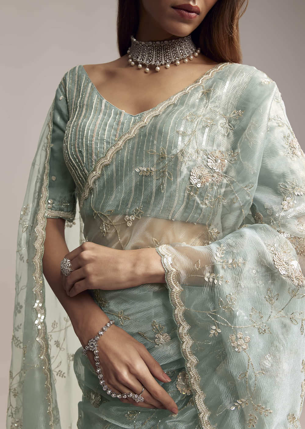 Blue Crush Tissue Saree With Heavy Floral Embroidery