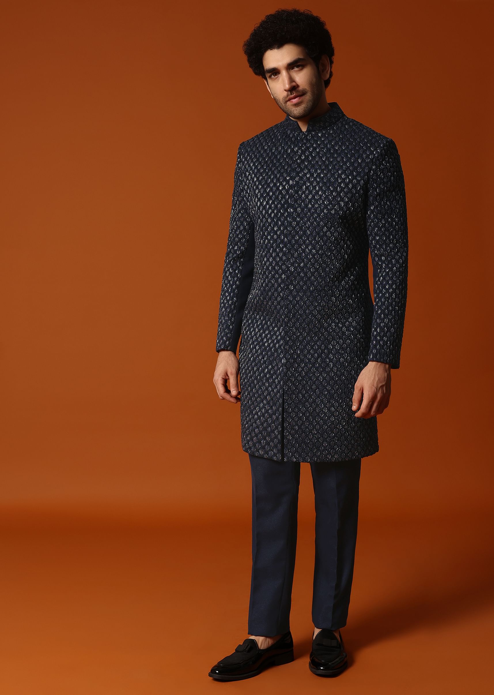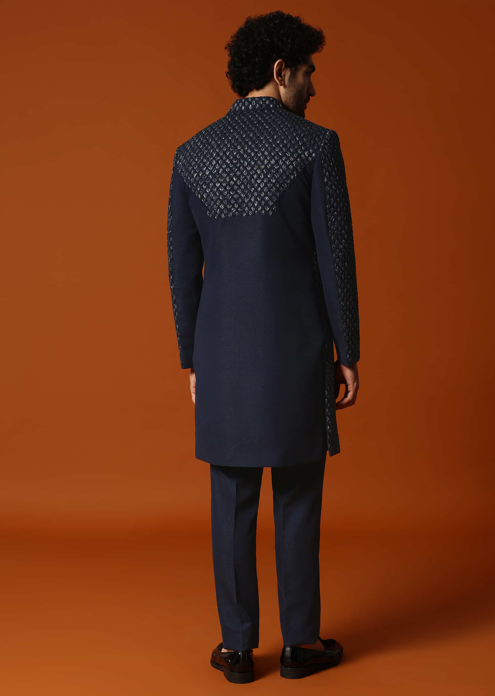 Blue Cutdana Embroidered Indowestern Suit For Men