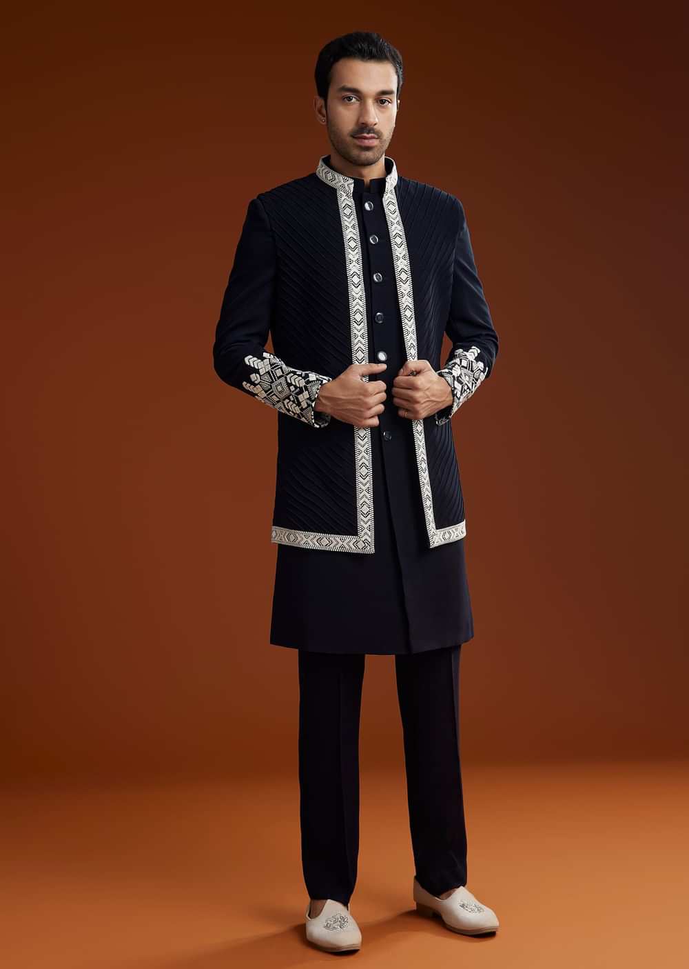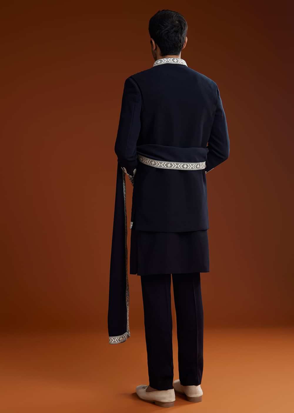 Designed for grandeur this blue open Indojacket set is crafted from Japanese fabric and adorned with delicate embroidery. The Mandarin collar full sleeves and front button closure enhance its regal aesthetic making it a showstopper for weddings and festive events.Awarded as the Most Trusted Brand we're delivering styles you love just as promised.