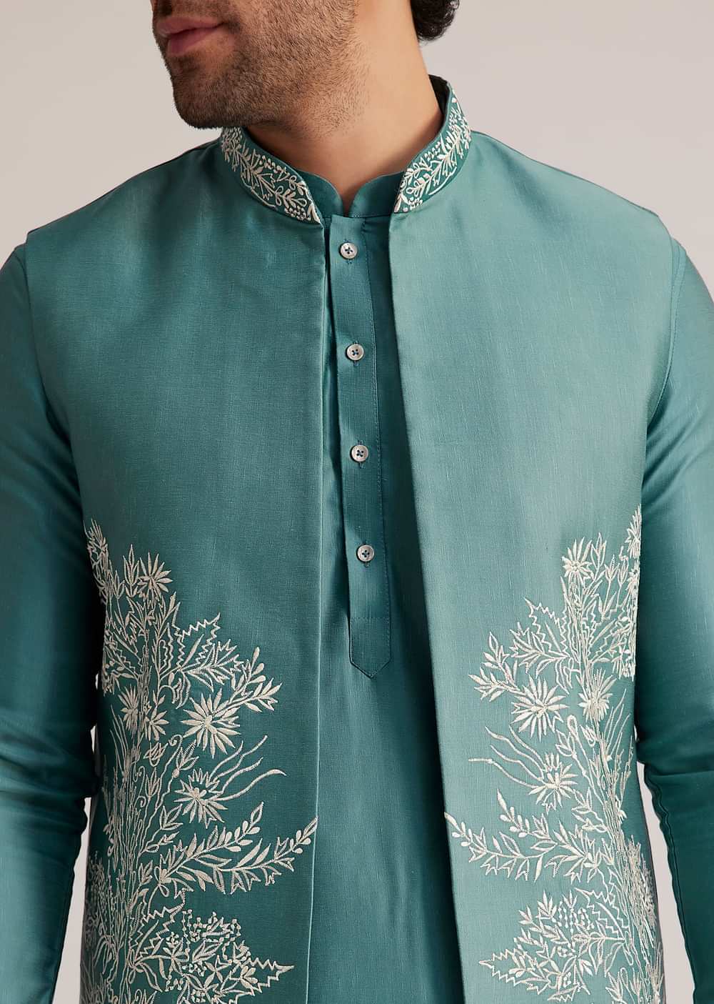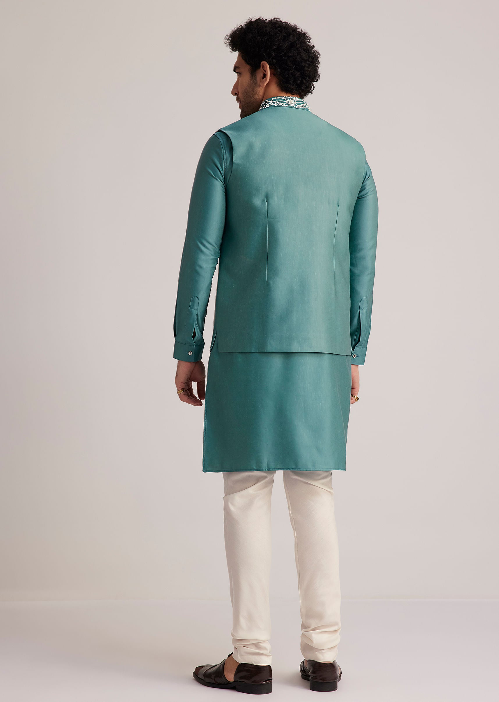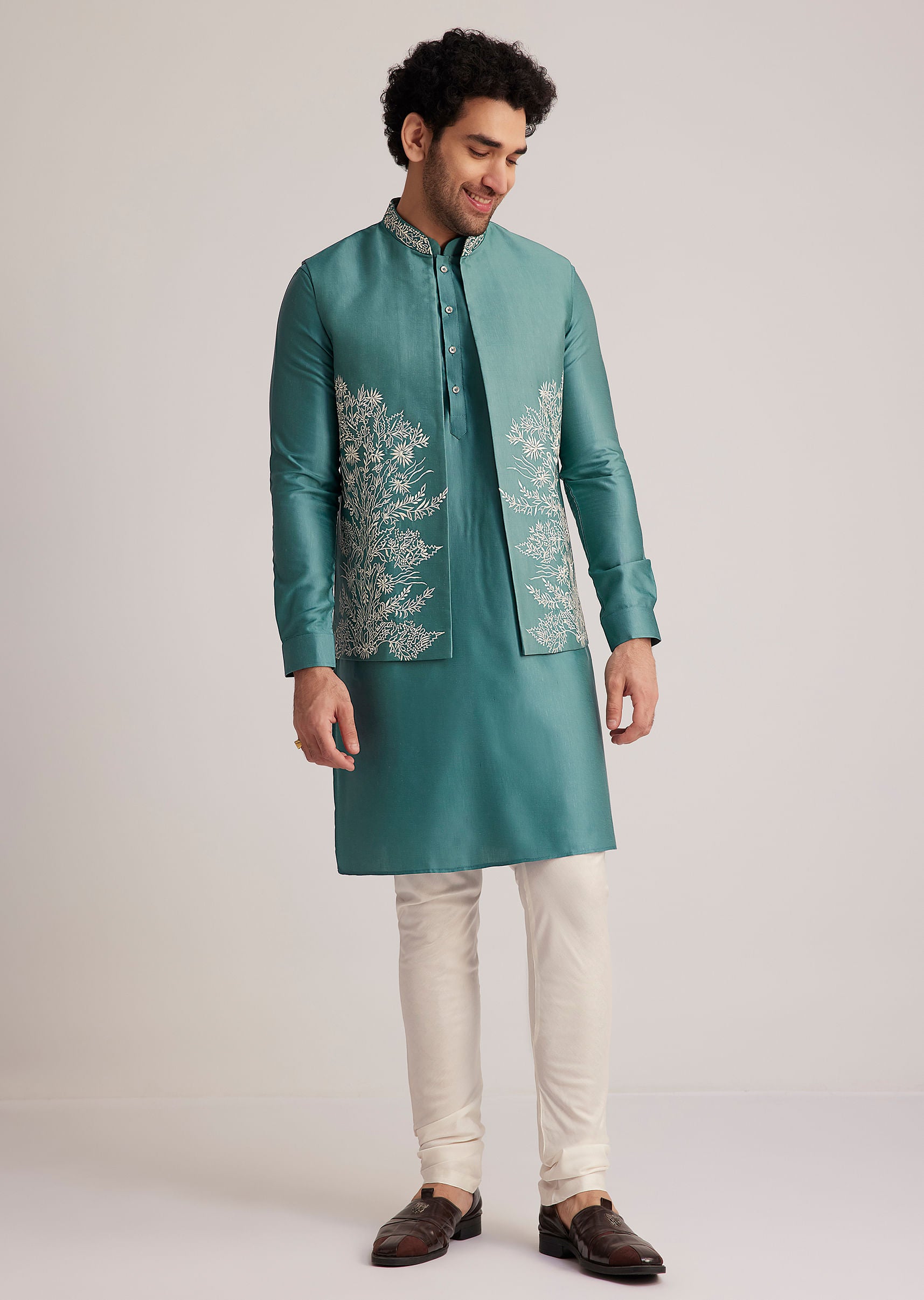 Fit Tips:Ensure the kurta and jacket fit comfortably across the chest and shoulders, and adjust the churidar for a snug fit at the waist and ankles for a sharp silhouette.