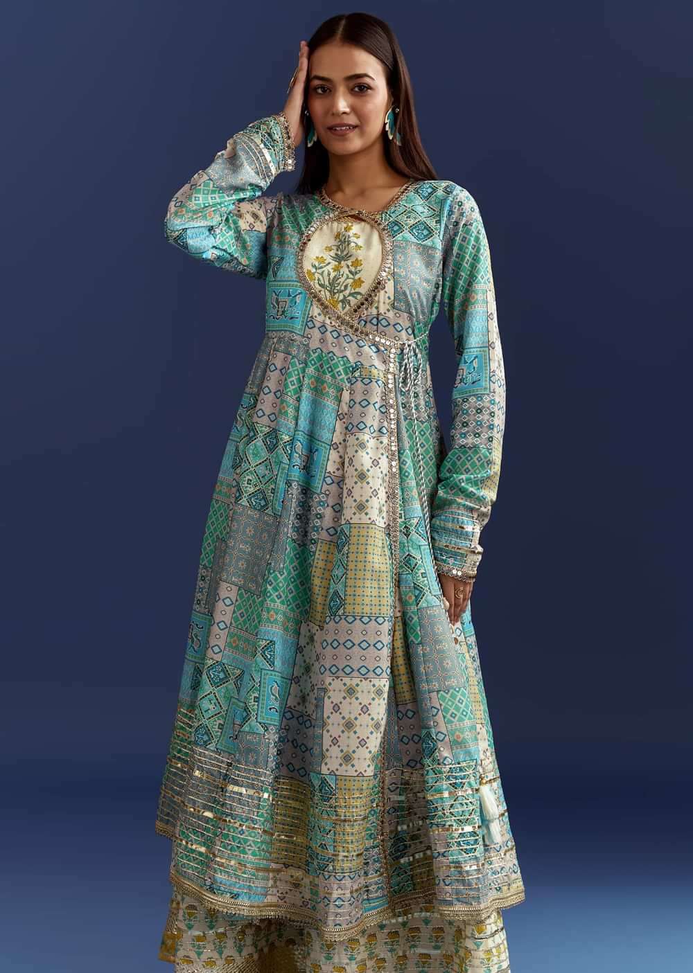 Blue Floral Angrakha Jacket With Gotta Lace Kurta