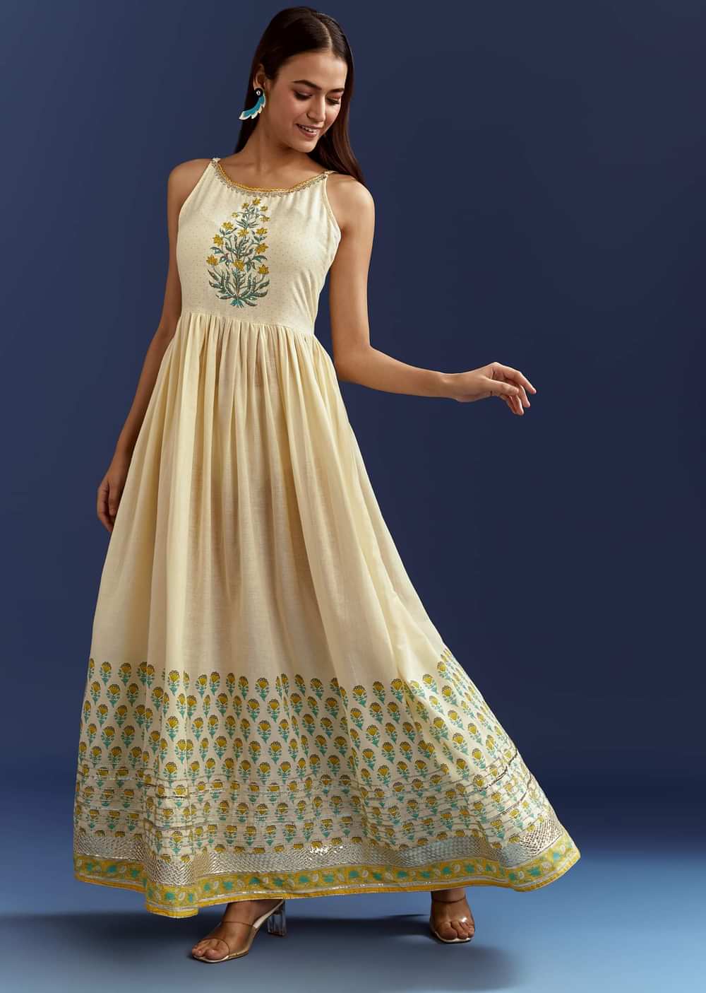 Crafted in cool tones, this blue sleeveless kurti features gotta lace detailing and a printed angrakha style jacket. Ideal for summer or pooja settings. Standard length for kurti is 58 inches for back.Awarded as the Most Trusted Brand, we're delivering styles you love, just as promised.