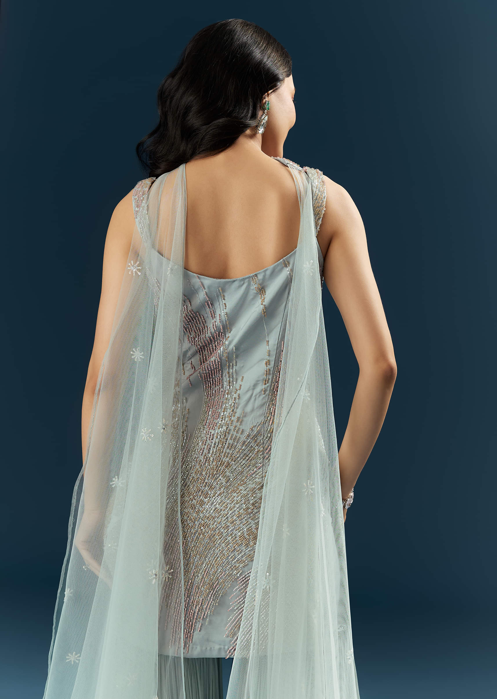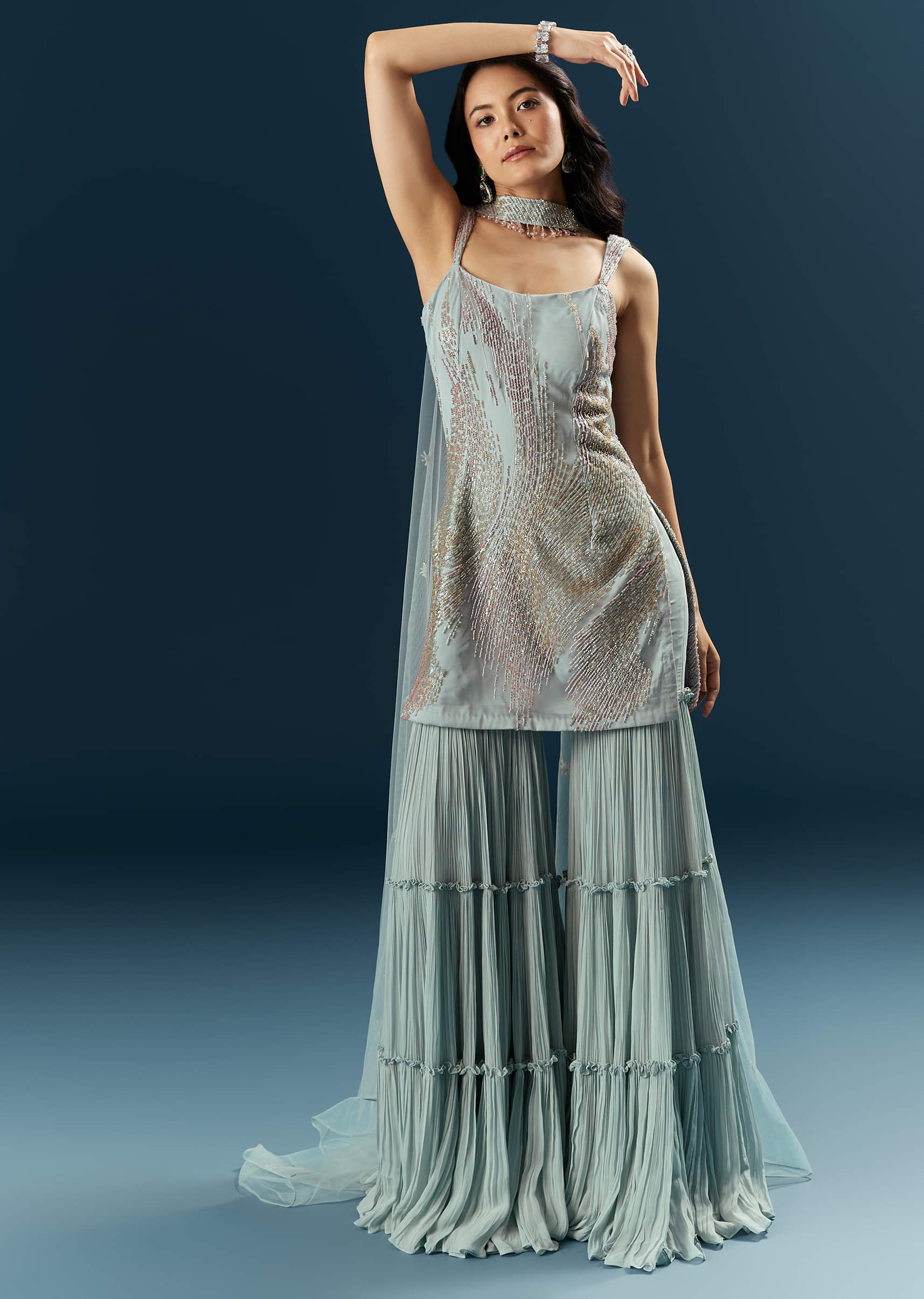 Cutdana embroidery lifts this blue imported net sharara suit, paired with flared bottoms for movement and a clean kurta for structure. Perfect for that bridesmaid who is always on her... More Product Details
