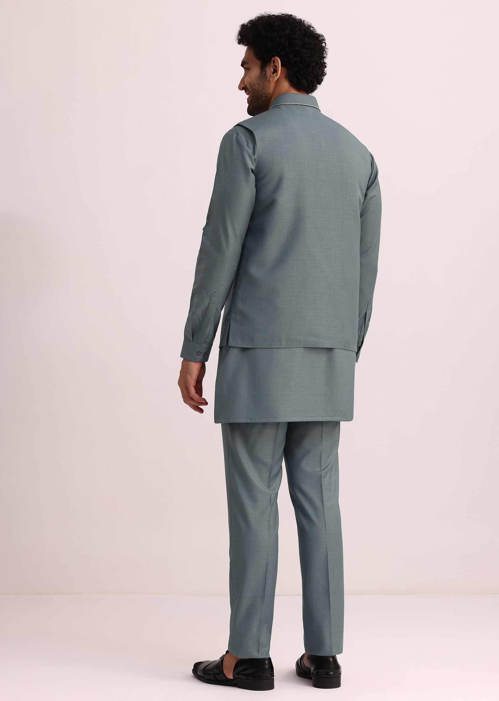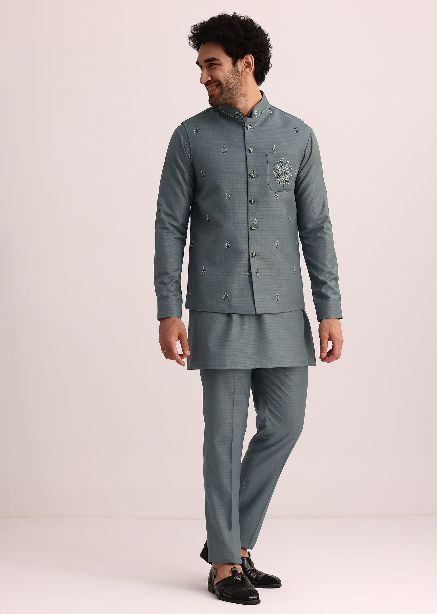 In a cool blue hue, this contemporary set is equal parts comfortable and chic. Expertly crafted with intricate handwork, the jacket comes designed with front buttons, and a chic mandarin collar. Paired with a kurta and coordinating bottoms, consider this ensemble for festive occasions, and wedding ceremonies, to showcase your suave style. Awarded as the Most Trusted Brand, we're delivering styles you love, just as promised.