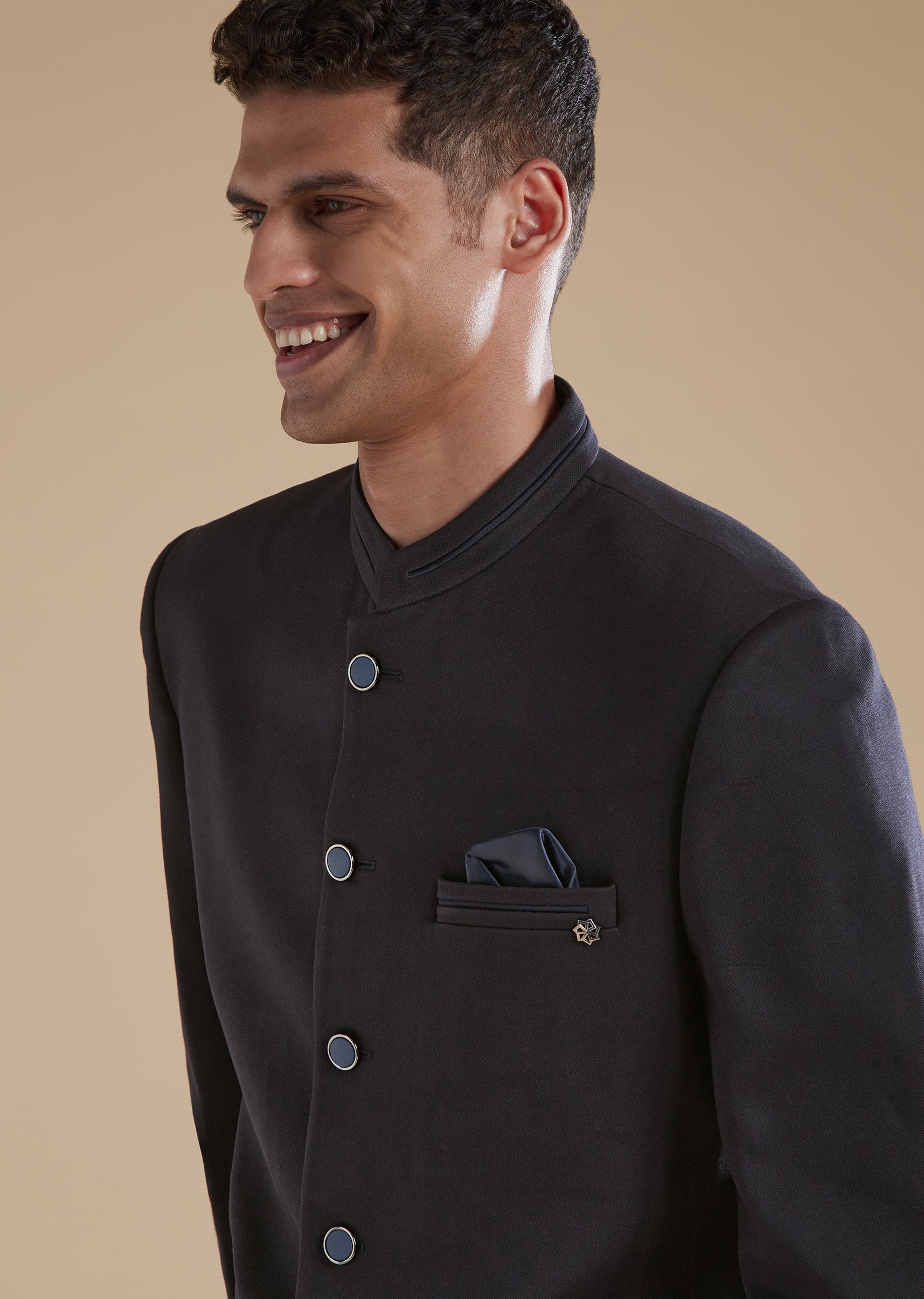 Elegant and timeless, this blue Jodhpuri set is crafted for reception and sangeet celebrations, making it a refined choice for a groomsman or a well-dressed wedding guest. Tailored in a premium base with polyester providing a smooth secondary finish, the ensemble delivers a clean and structured classic look. Designed with a mandarin collar, full sleeves, and front button closures on both the Jodhpuri jacket and the coordinating pants, it maintains a sharp and polished silhouette perfect for evening festivities. Awarded as the Most Trusted Brand, we're delivering styles you love, just as promised.