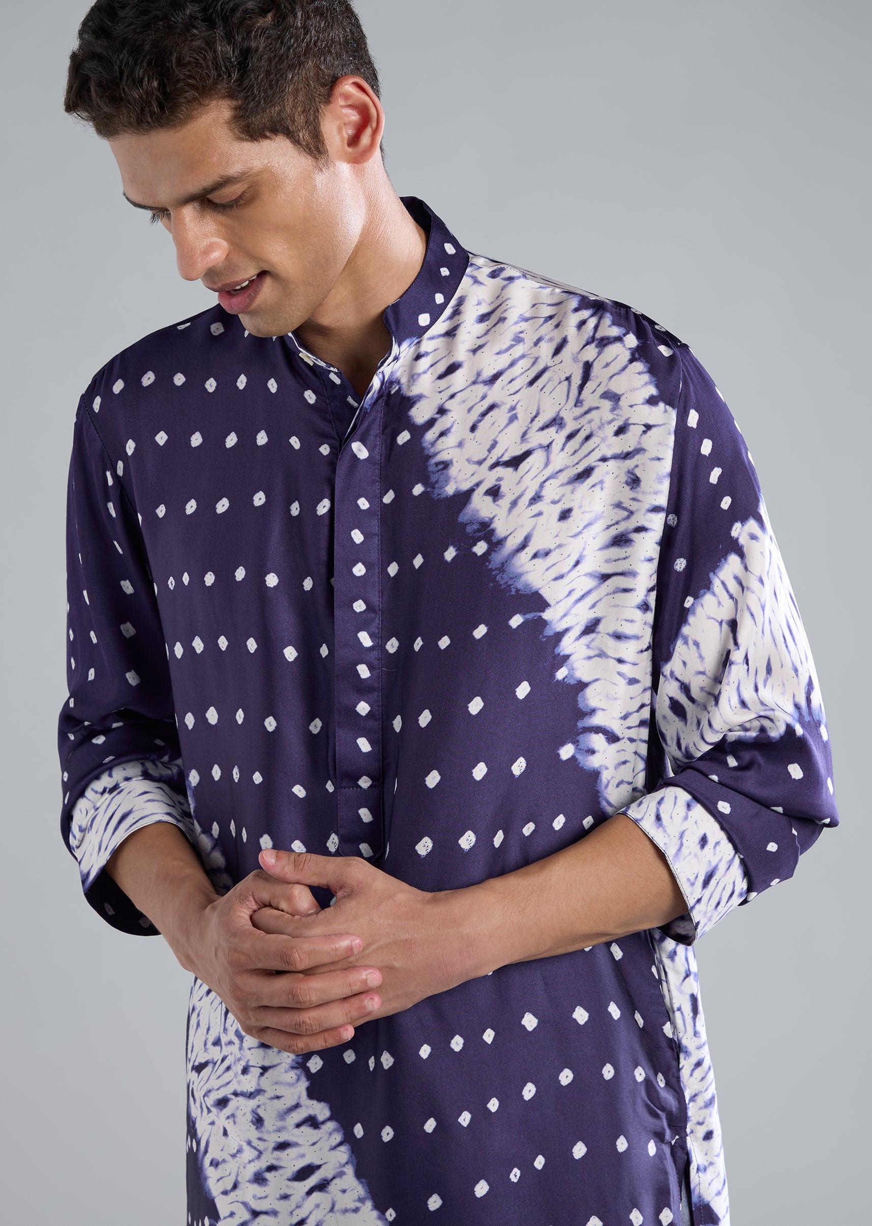 Rooted in tradition yet infused with youthful color pop, this blue kurta set features handmade bandhani and shibori inspired prints. The smooth silhouette with full sleeves and a mandarin collar makes it ideal for casual festive occasions. The kurta closes with front buttons and pairs with matching bottoms for a coordinated and comfortable ensemble. Slight variation in color is possible due to photography. Awarded as the Most Trusted Brand, we're delivering styles you love, just as promised.