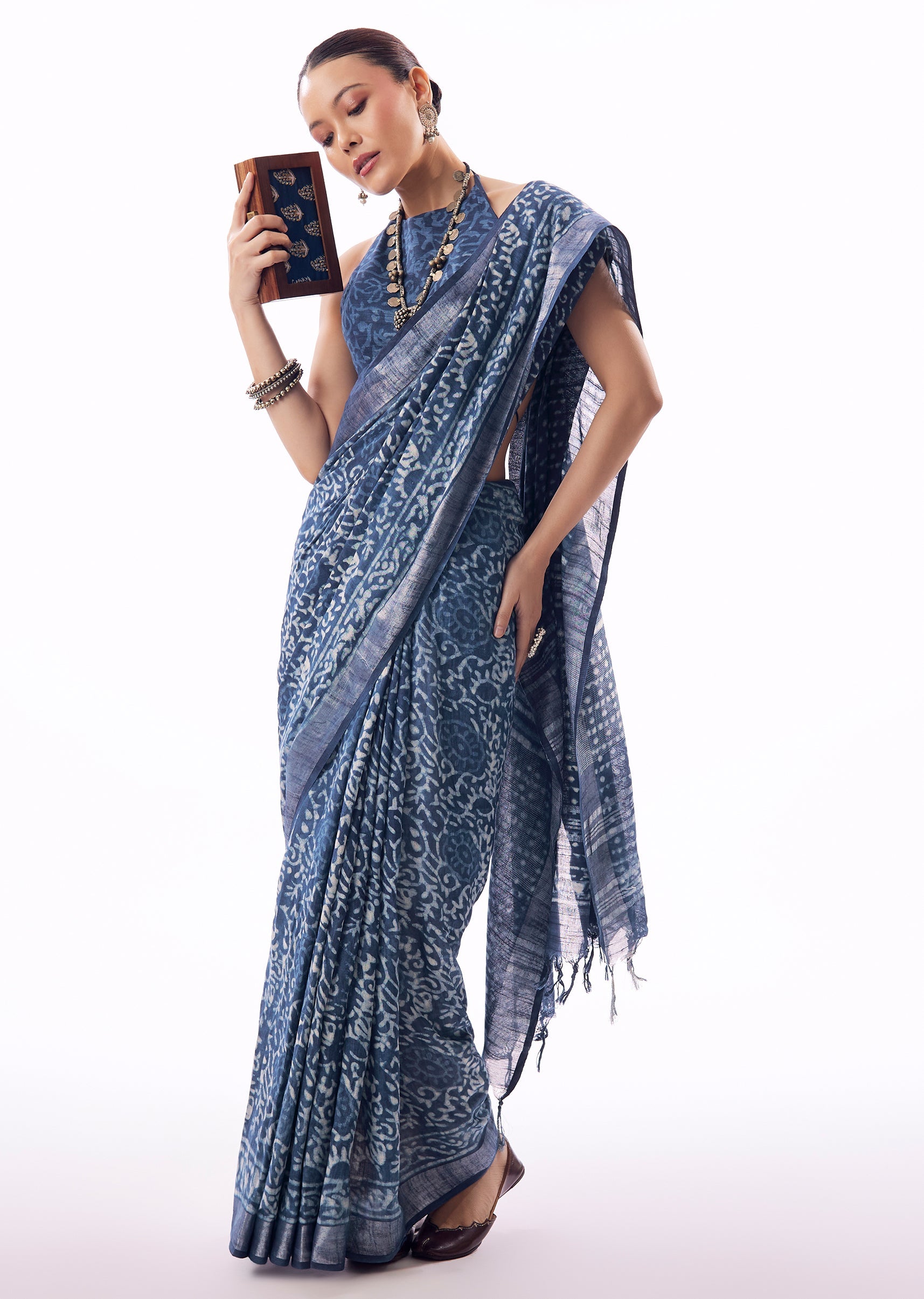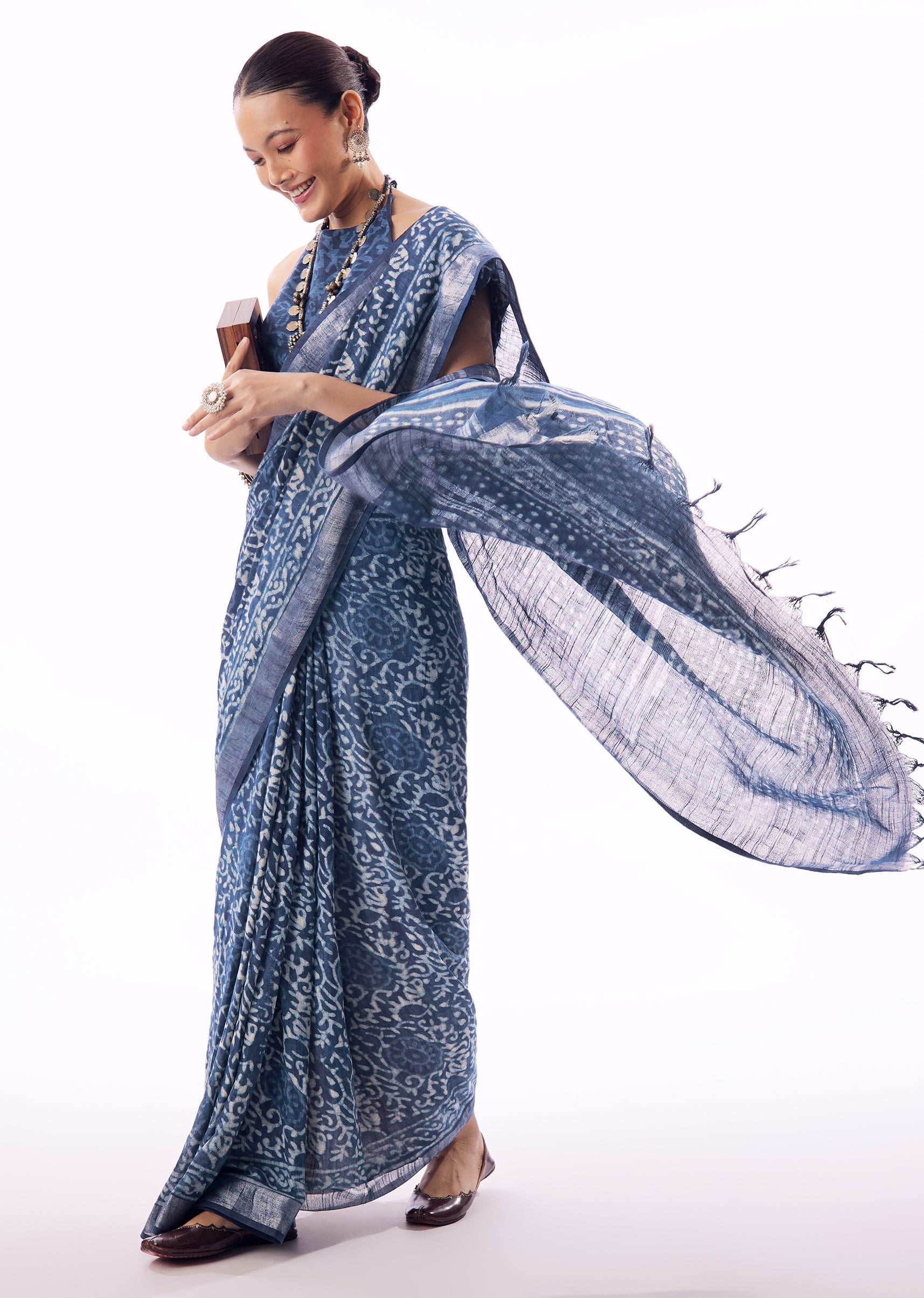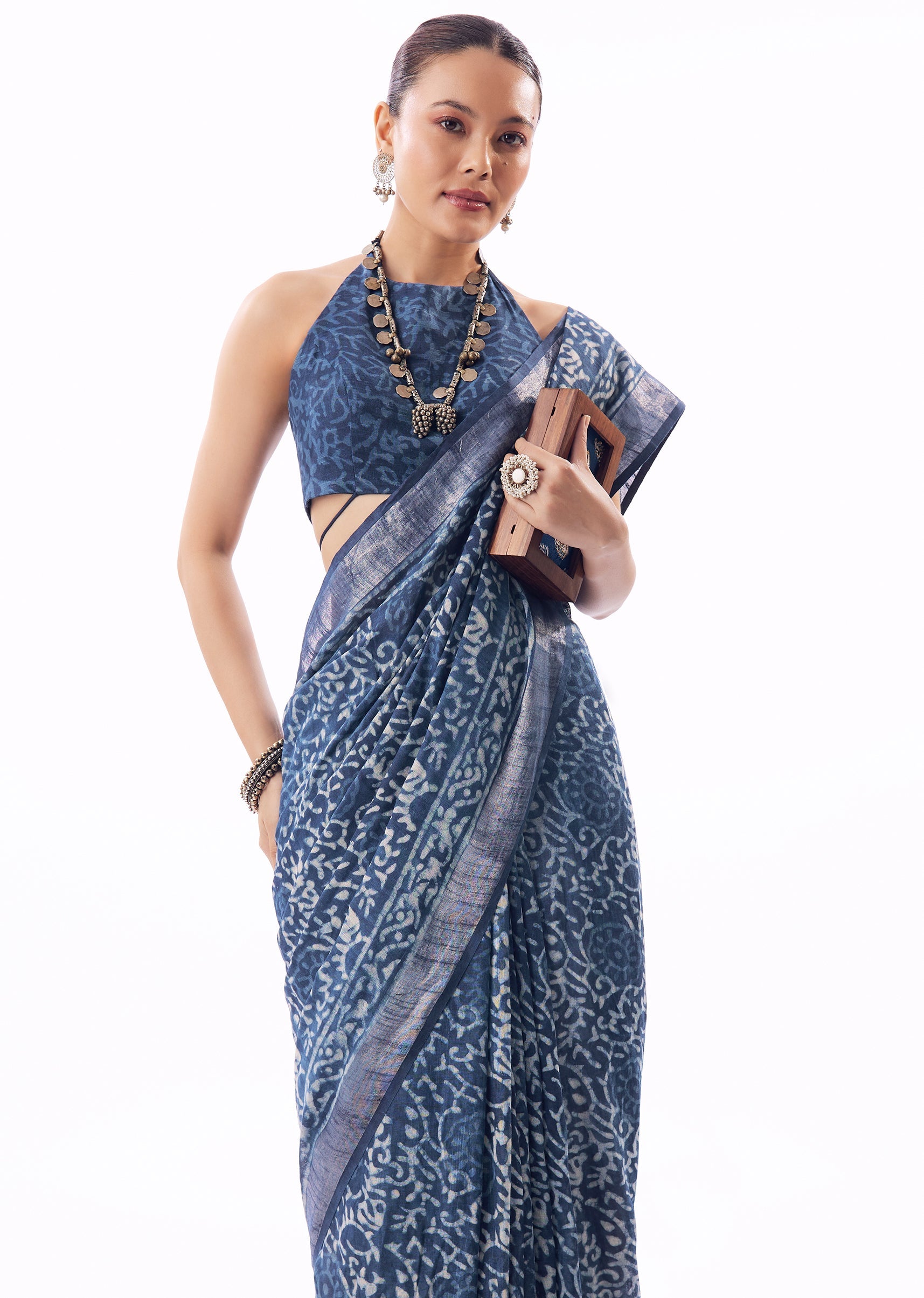 Keep it minimal with silver oxidised jewellery and soft makeup. A sleeveless or elbow-sleeve blouse enhances the relaxed elegance.