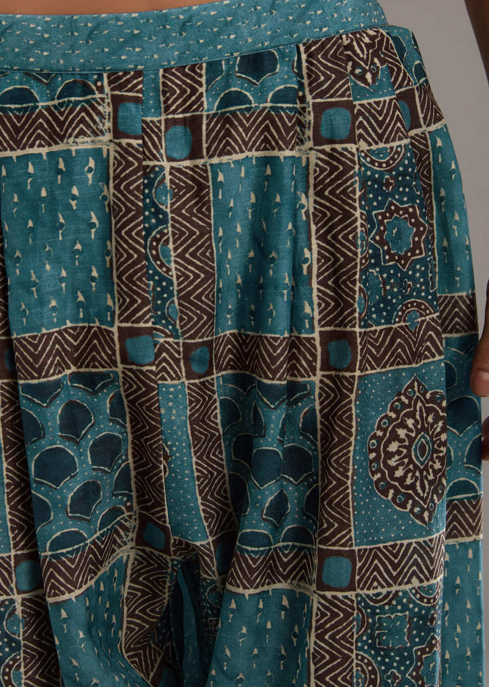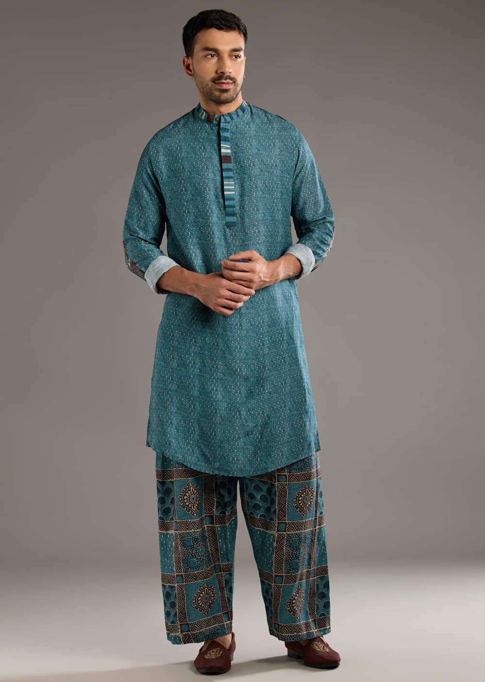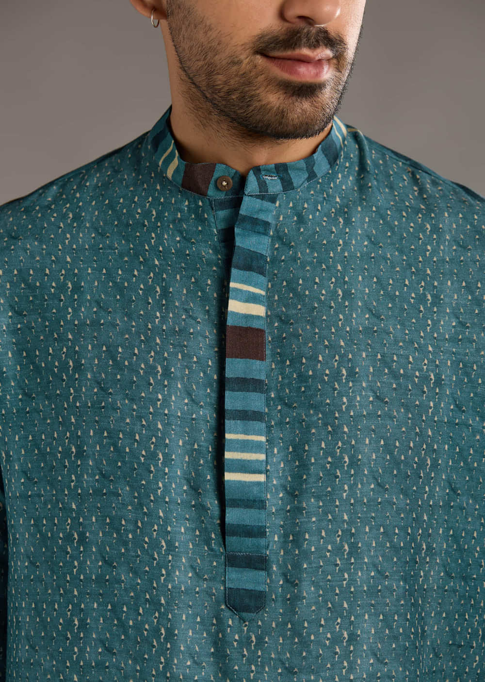 Blue Linen Kurta Set For Men With Hand Block Ajrakh Print