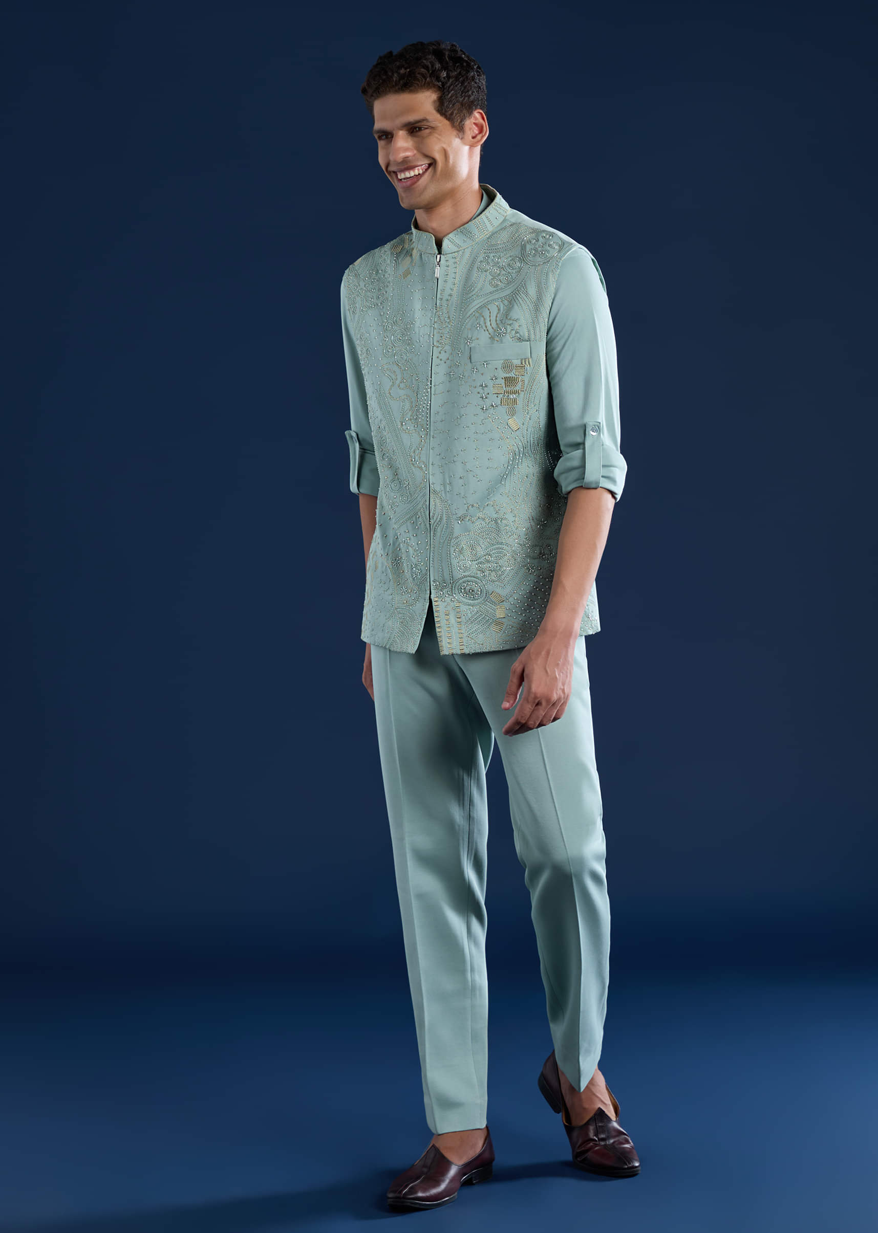Blue Mens Cutdana Work Jacket Kurta and Pant Set