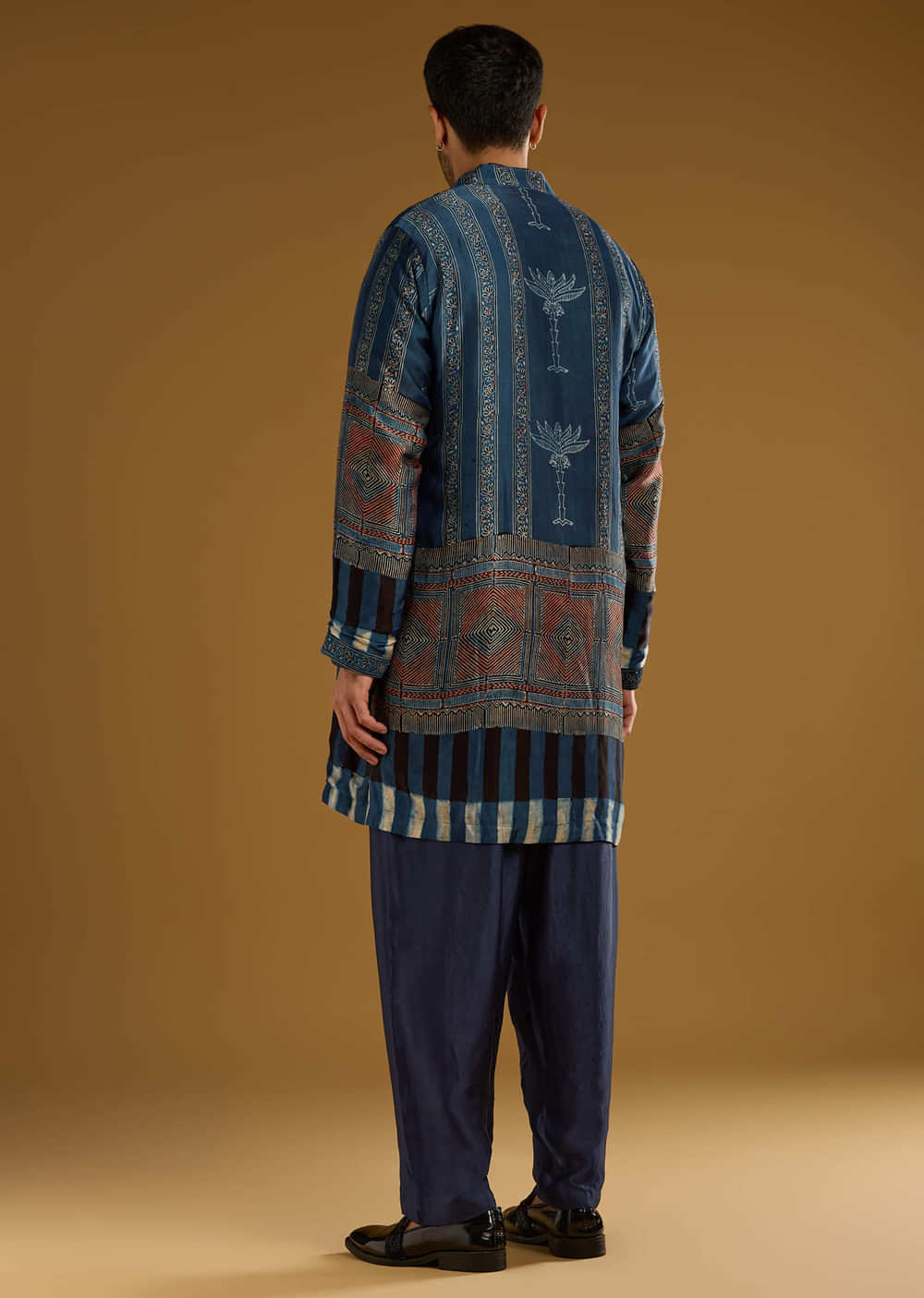 Blue Modal Linen Kurta Jacket Set For Men With Hand Block Ajrakh Print