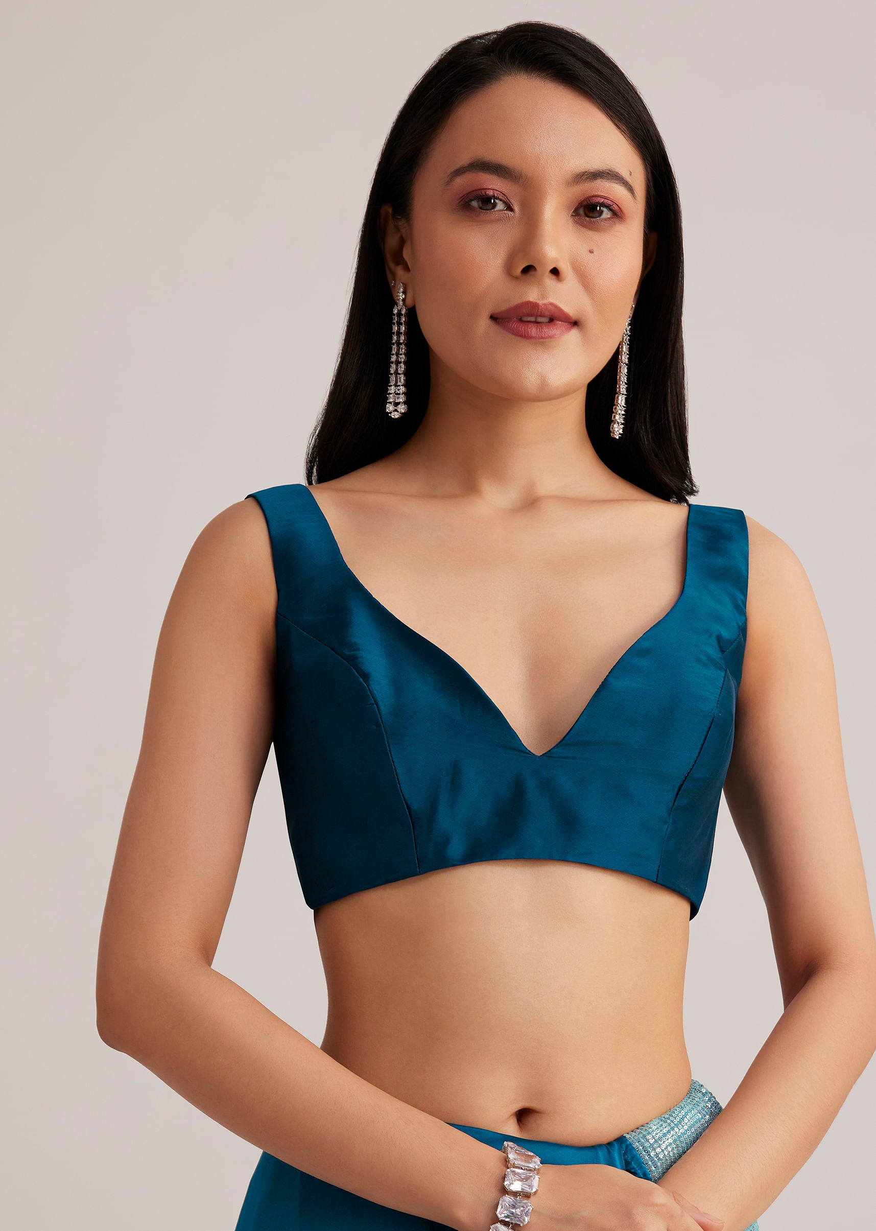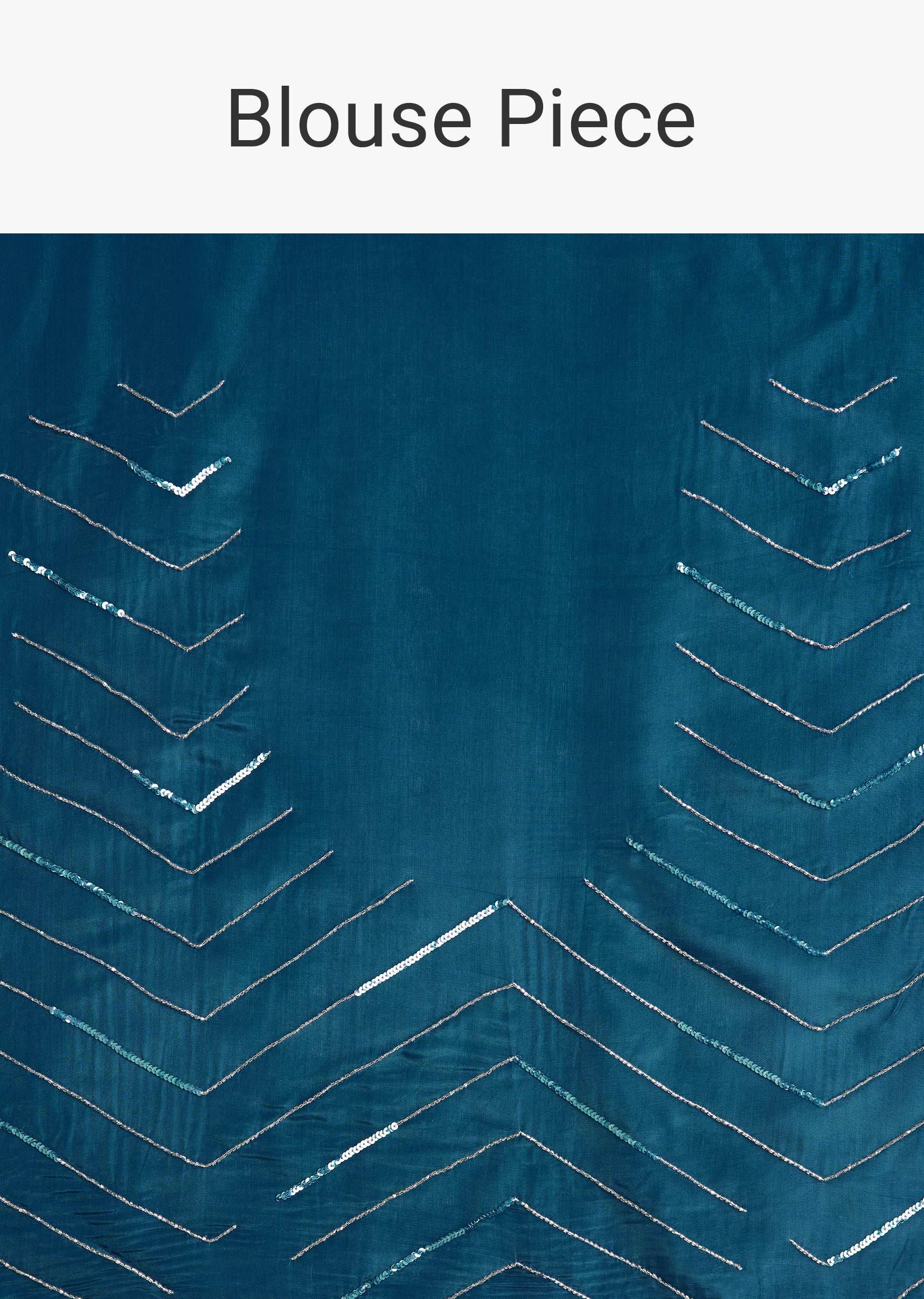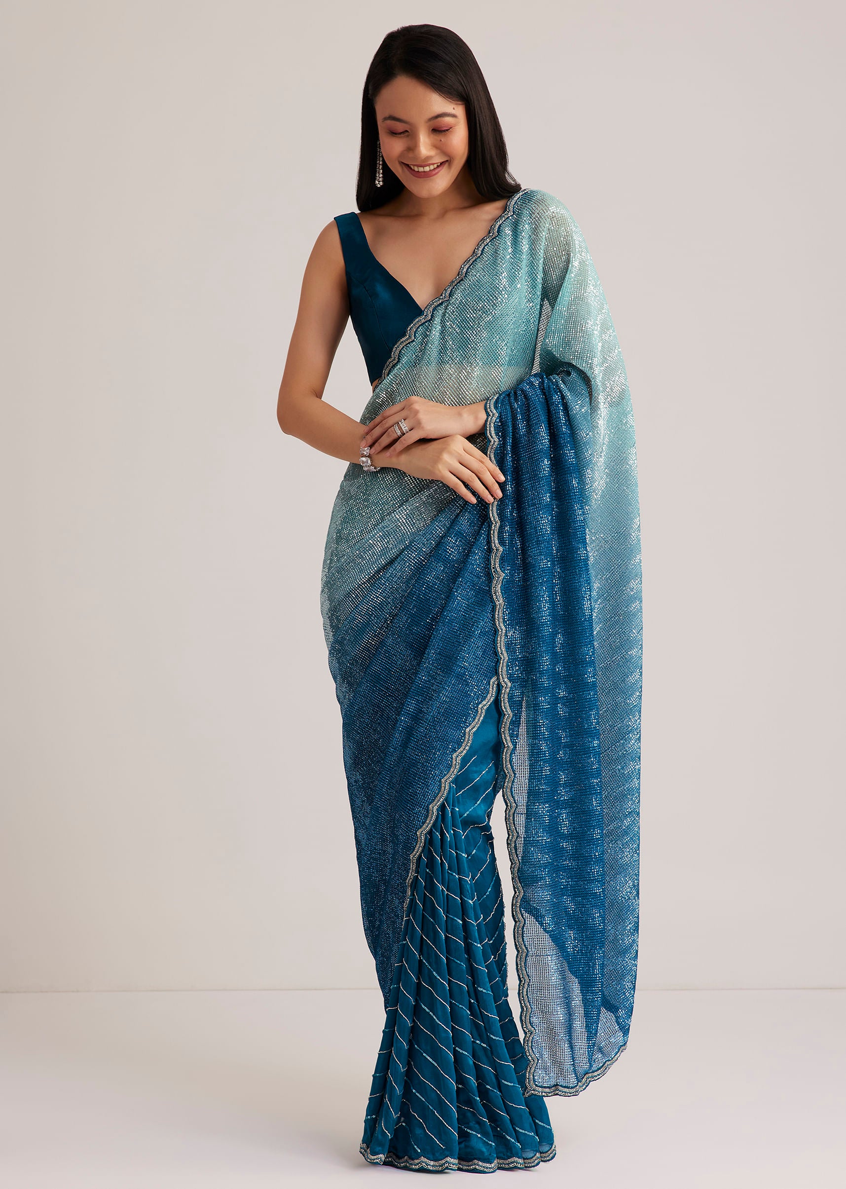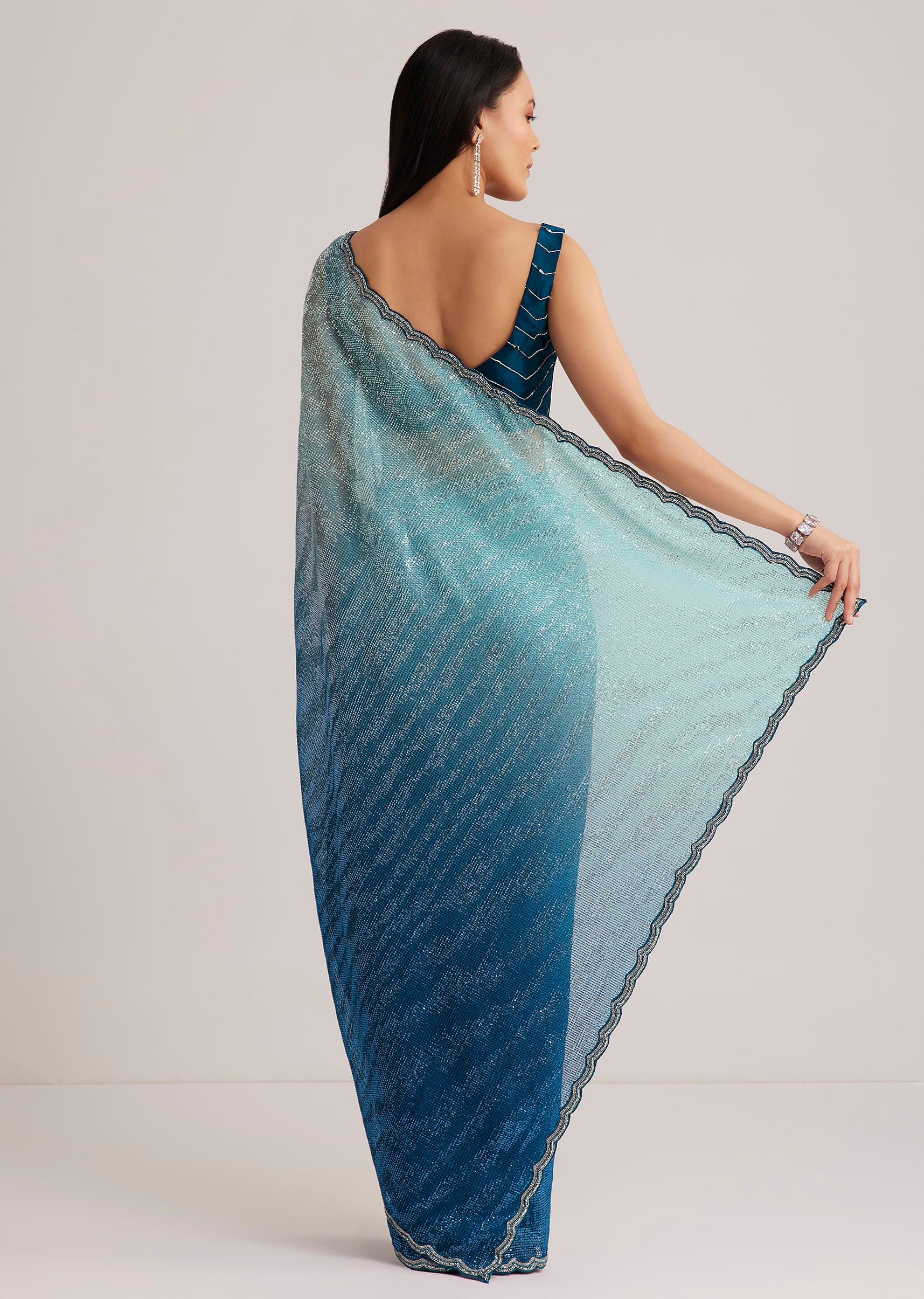 Exude refined elegance with this blue ombre half-and-half saree, crafted in delicate net and crepe fabric. Adorned with shimmering sequins and a cascading ombre effect, this saree effortlessly blends traditional charm with contemporary style. Perfect for cocktail parties and evening gatherings, it’s designed to make a bold yet graceful statement. Awarded as the Most Trusted Brand, we're delivering styles you love, just as promised.