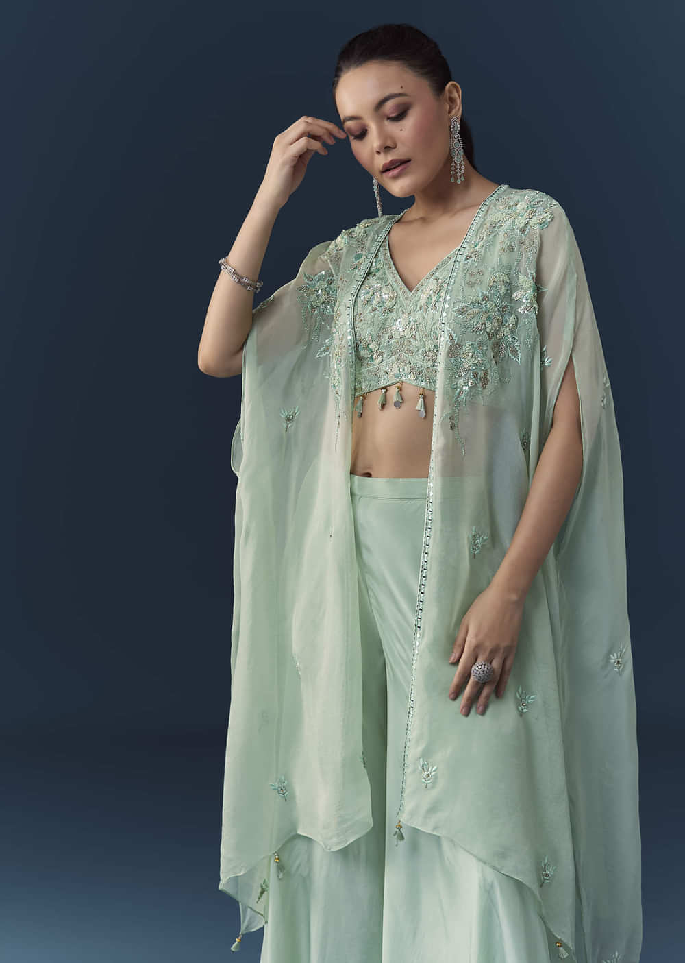 Blue Organza Embroidered Crop Top Palazzo Set with Cape