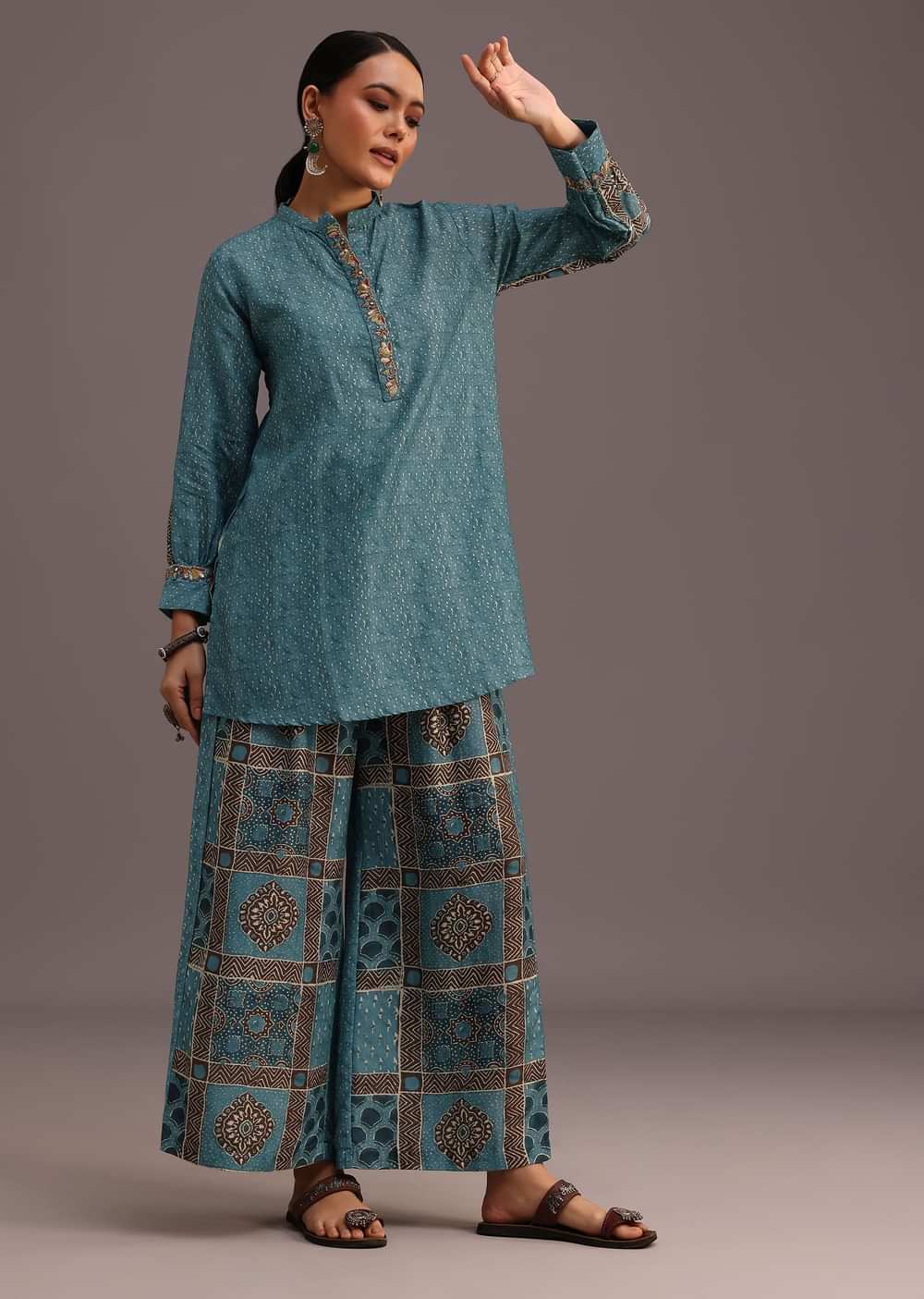 - Embrace the ethereal beauty of this blue printed kurta and palazzo set.