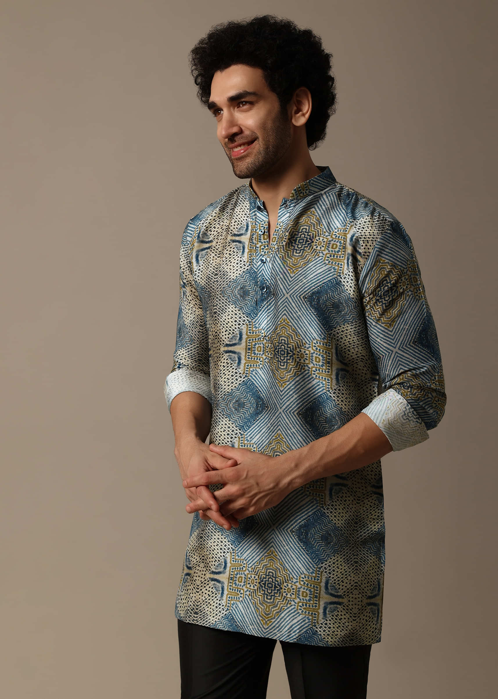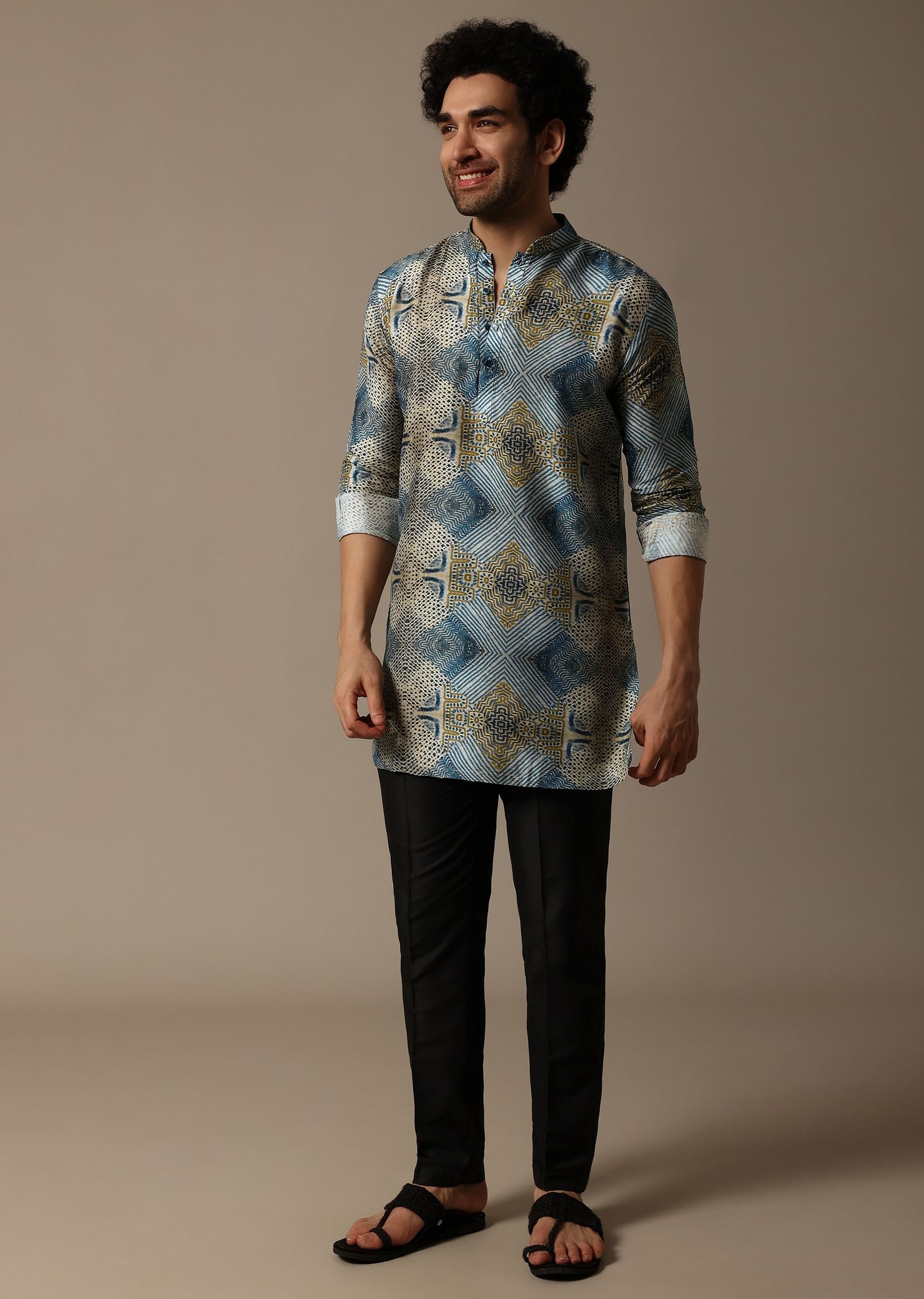 - Step into sophistication with our carefully crafted blue short kurta set tailored for festive extravagance.