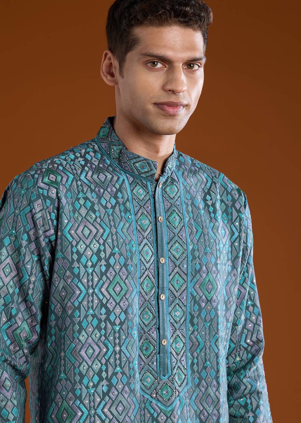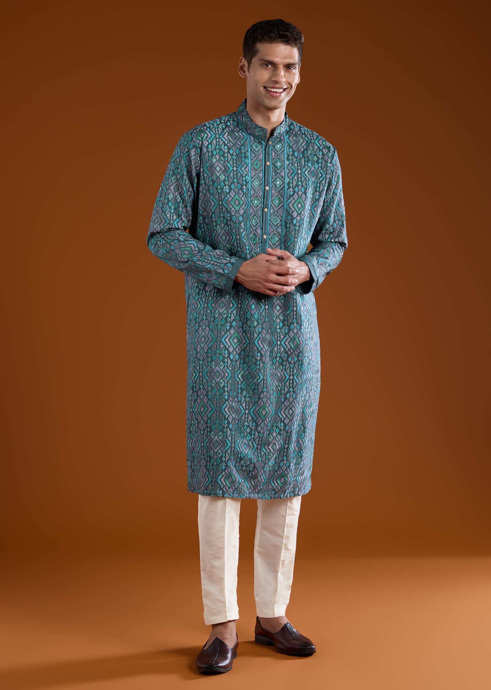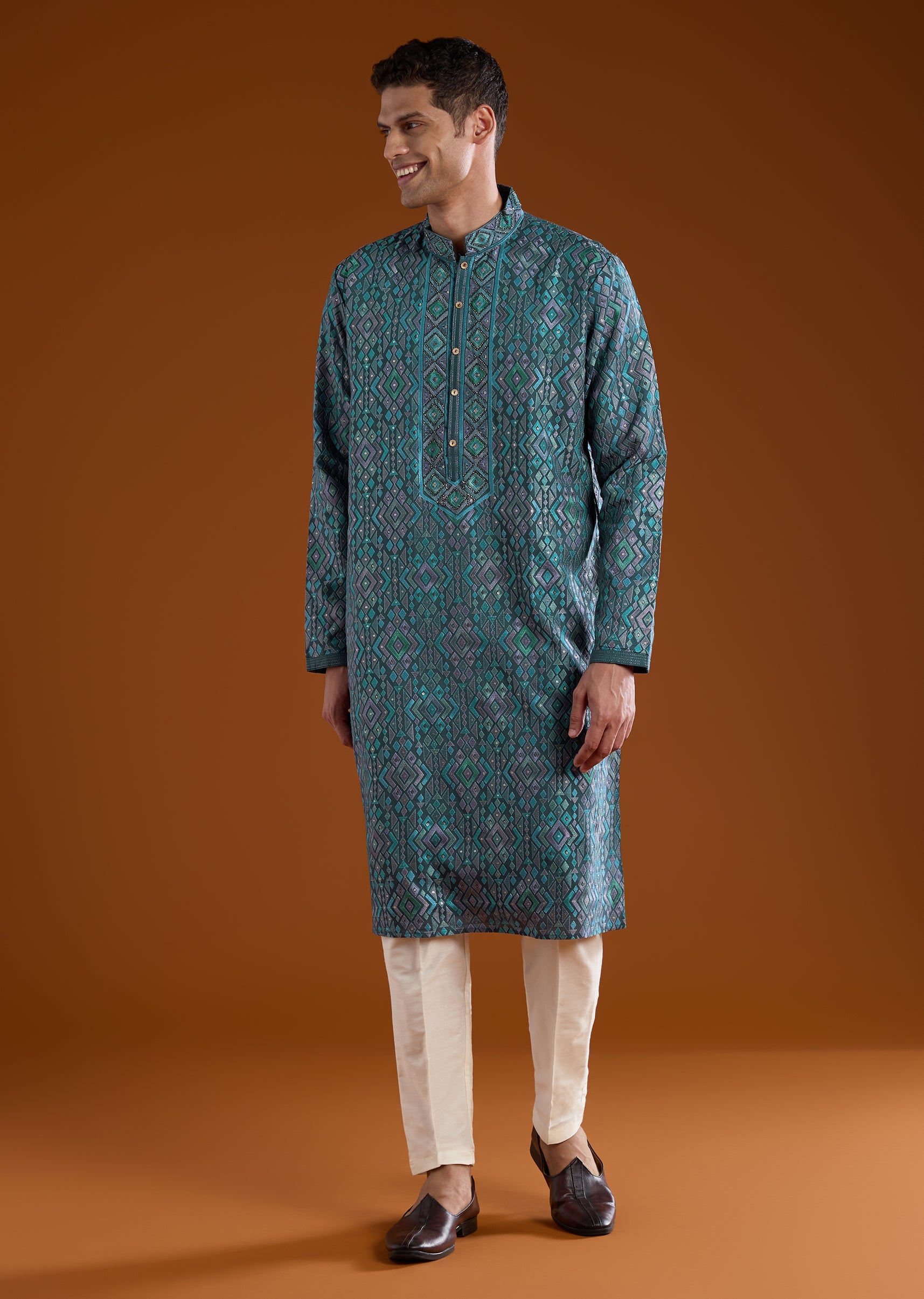 Blue Resham Motif Mens Kurta Pant Set in Silk