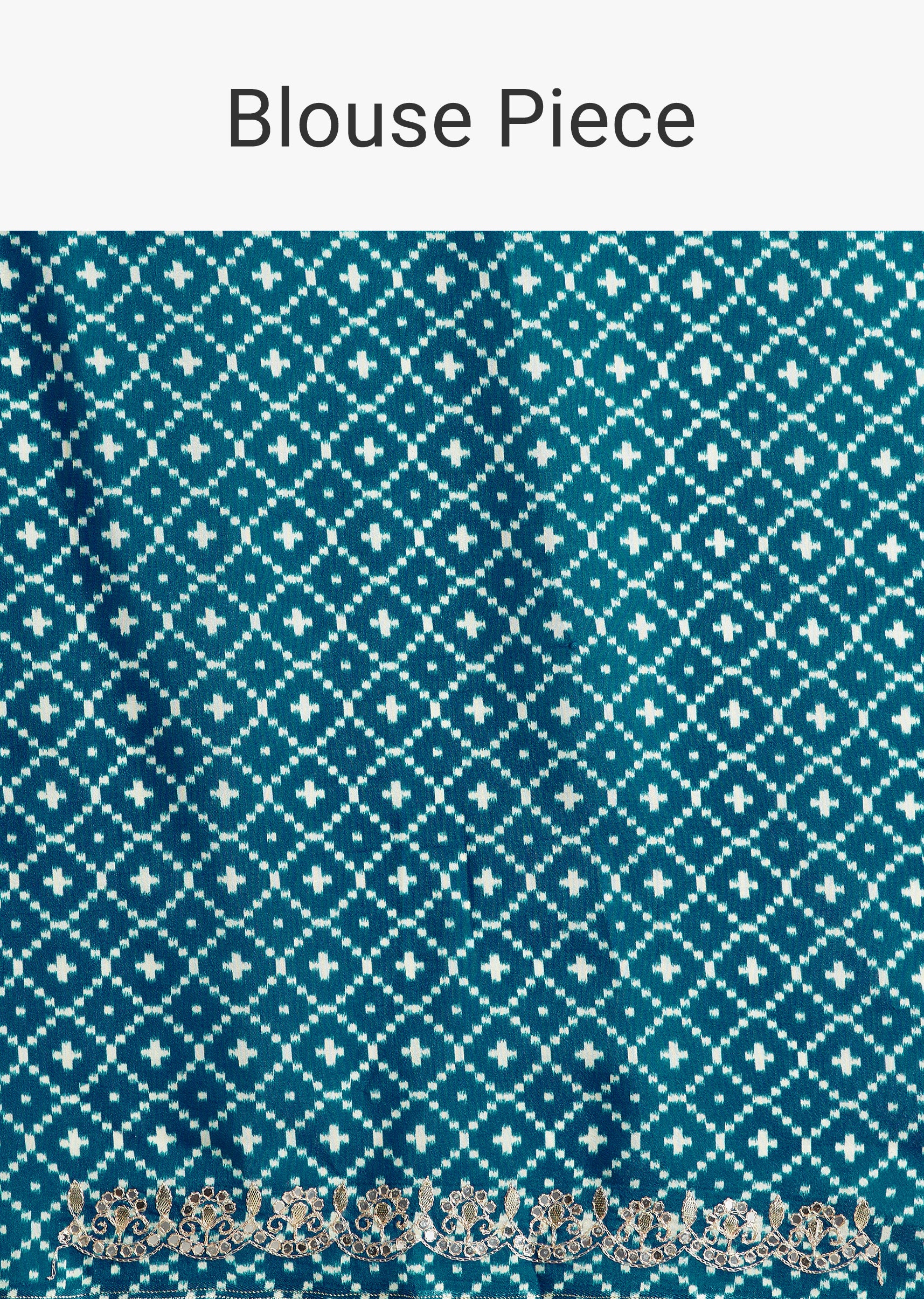 Blue Satin Ikat Printed Saree With Gota And Mirror Embroidery