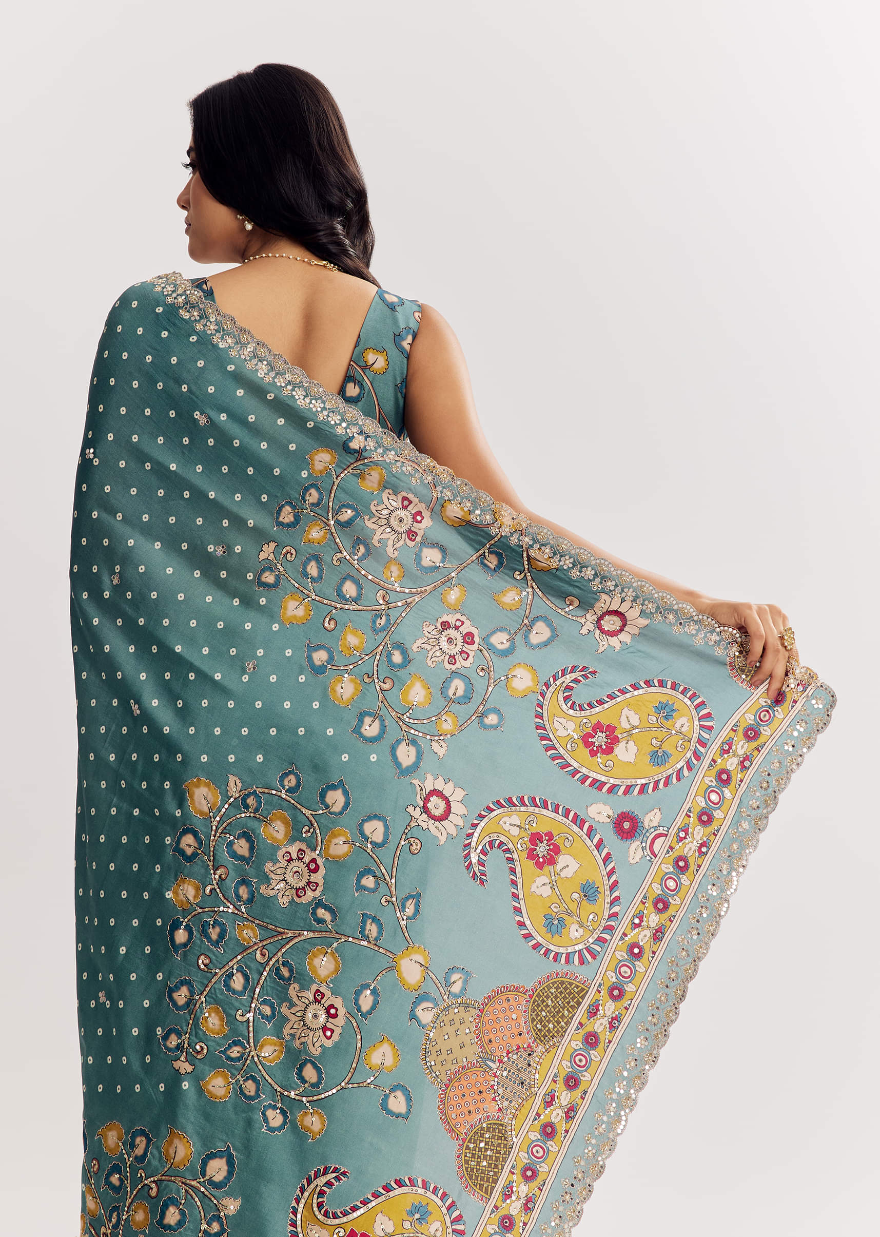 Blue Shaded Muslin Printed Saree With Mirror Gota Zari And Sequins