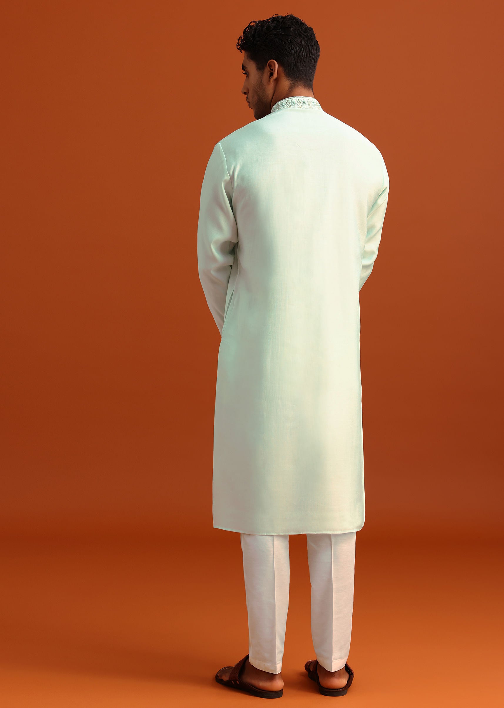 - Crafted from opulent silk, the kurta is enriched with intricate hand embroidery on the yoke.