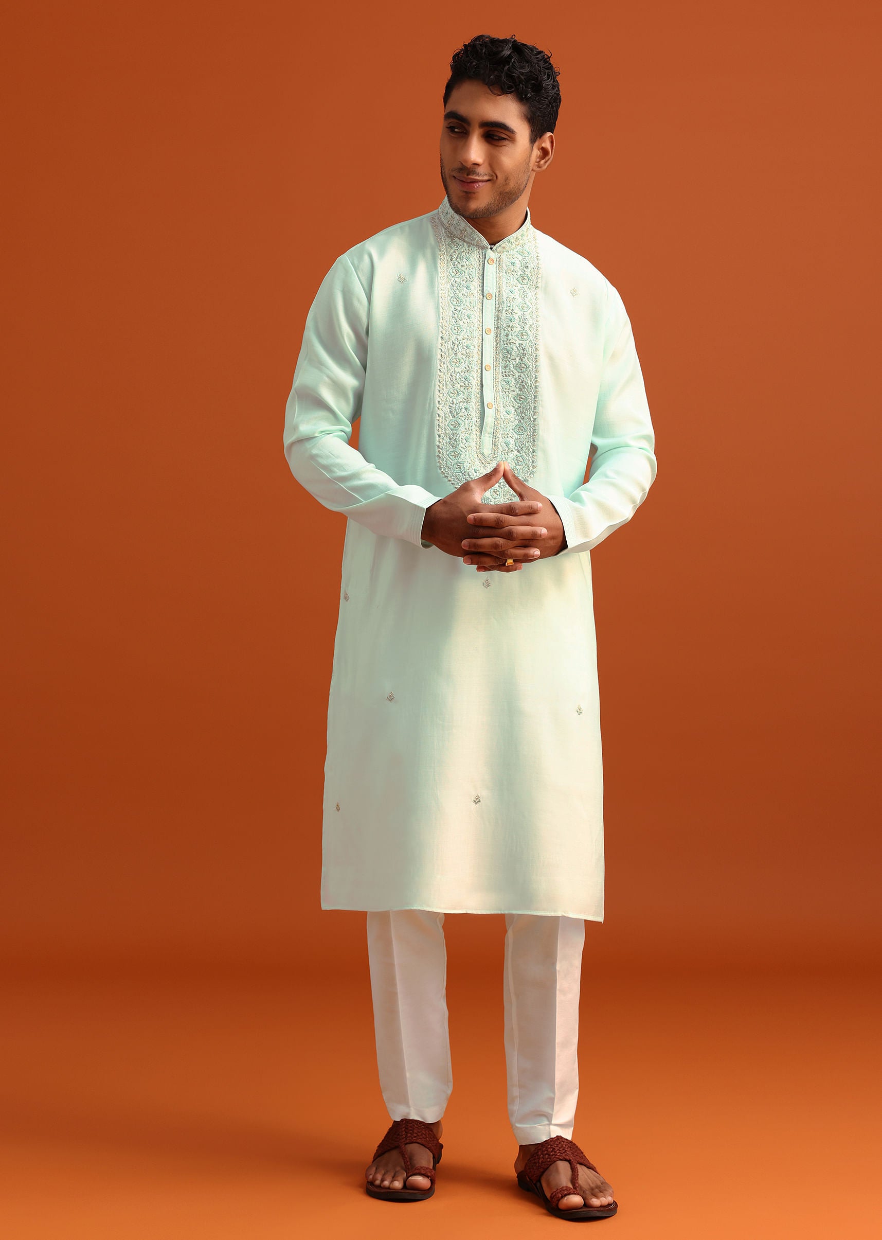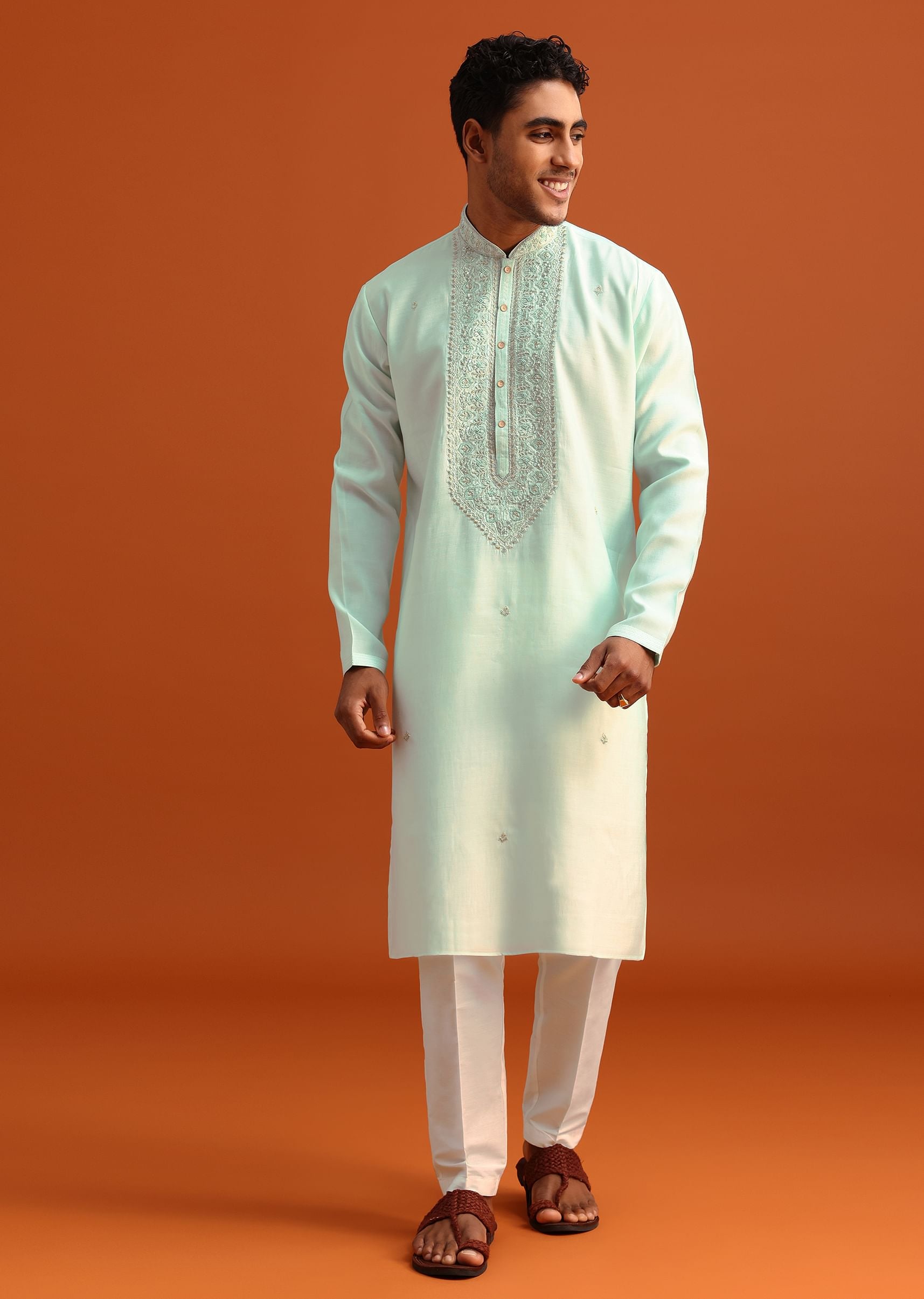 - Featuring a refined mandarin collar, front placket and full sleeves, this contemporary fit is perfect for year-round festivals and wedding celebrations.