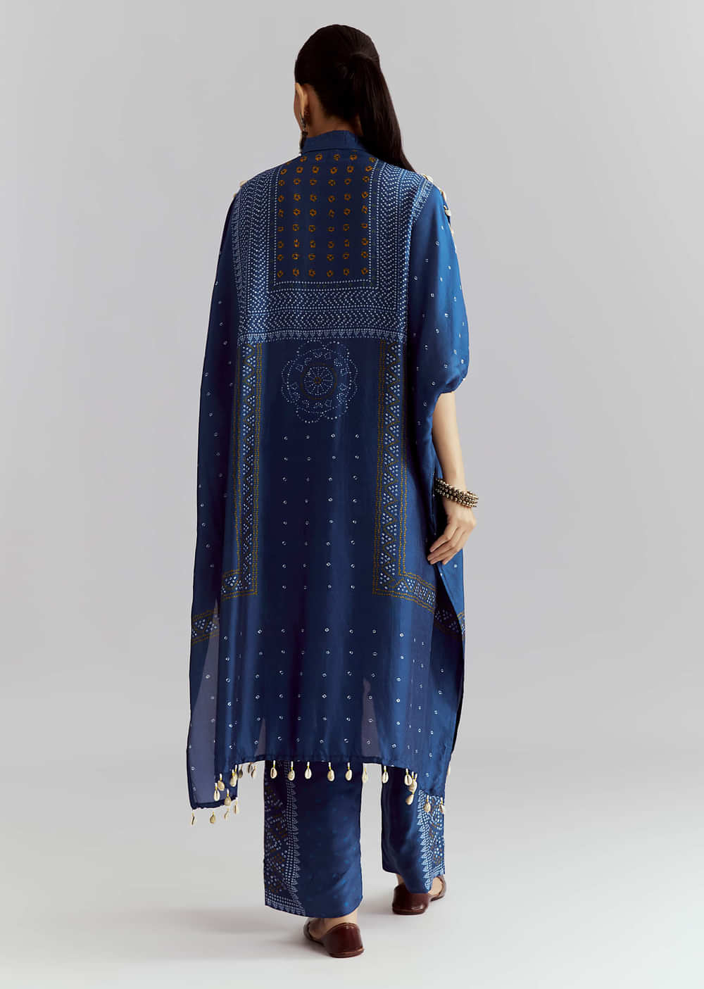 Blue Silk Kaftaan Kurta Set With Bandhani Print