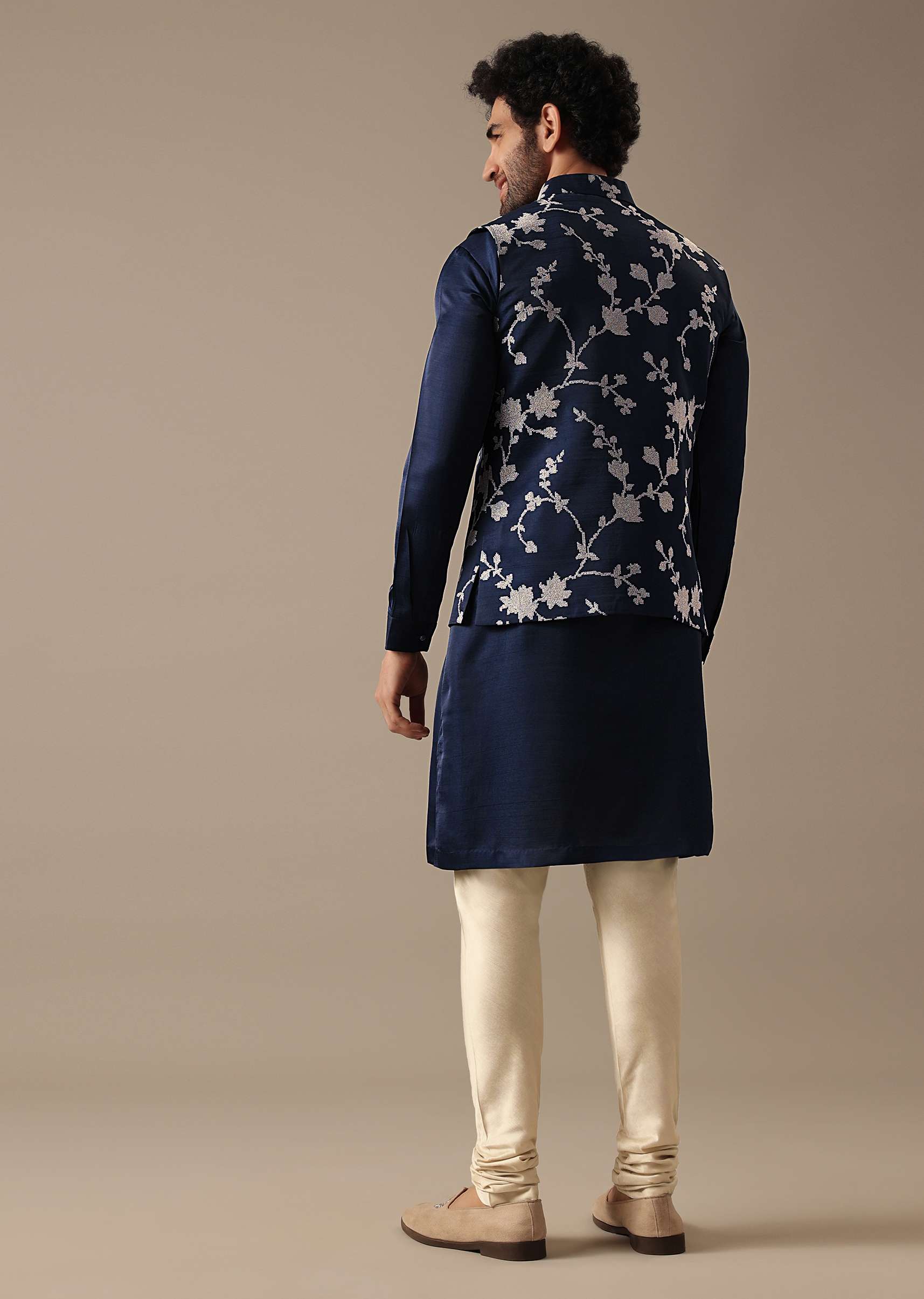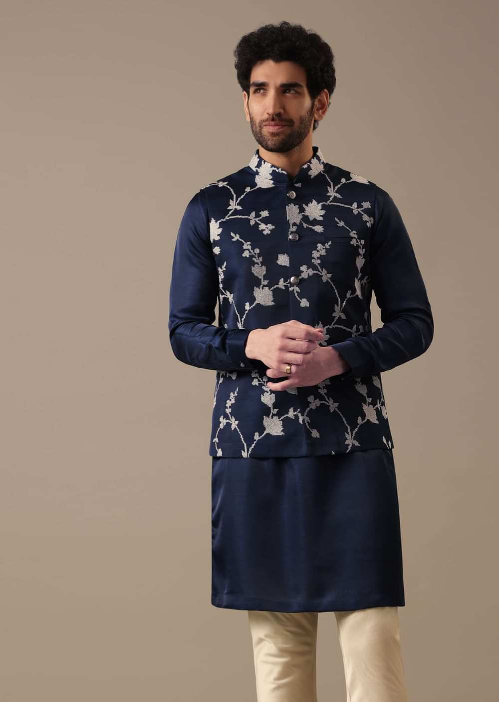 - Be it an engagement ceremony or a wedding function, this blue kurta jacket set is a head-turner.